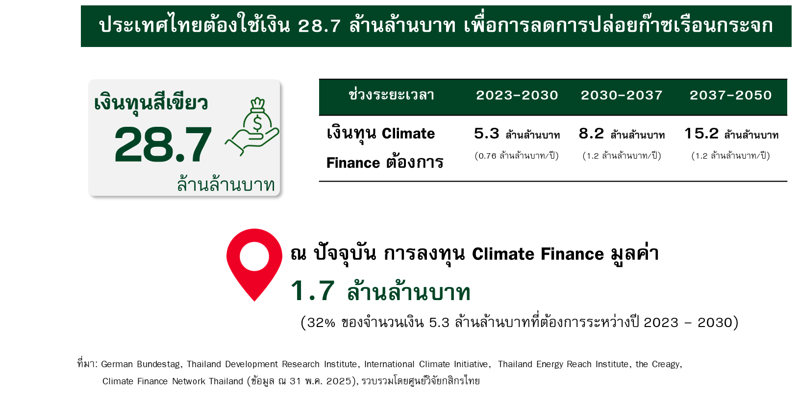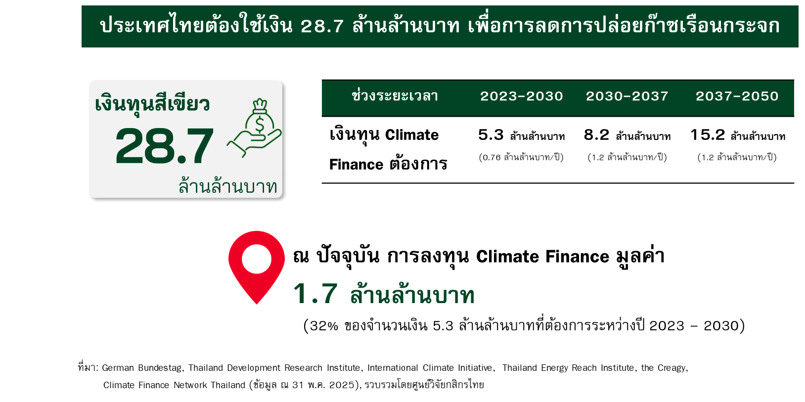 · ช่องว่างทางการเงินด้าน Climate Finance ของไทยยังมีอยู่มาก โดยปัจจุบันไทยลงทุนด้านการเงินเพื่อสภาพภูมิอากาศเพียง 1.7 ล้านล้านบาท แต่ความต้องการสูงถึง 28.7 ล้านล้านบาท เพื่อบรรลุเป้าหมายการลดการปล่อยก๊าซเรือนกระจก