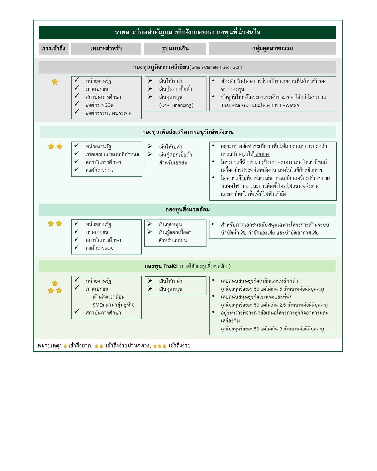 · รูปแบบมี ตั้งแต่ Grant, Seed Funding, Loan ไปจนถึง Co-Finance แต่ละประเภทมีข้อดี–ข้อจำกัดต่างกัน การเลือกใช้ที่เหมาะสมจะช่วยให้ธุรกิจไทย โดยเฉพาะผู้ประกอบการรายเล็ก สามารถขับเคลื่อนโครงการด้านสิ่งแวดล้อมและแข่งขันได้ในเวทีโลก