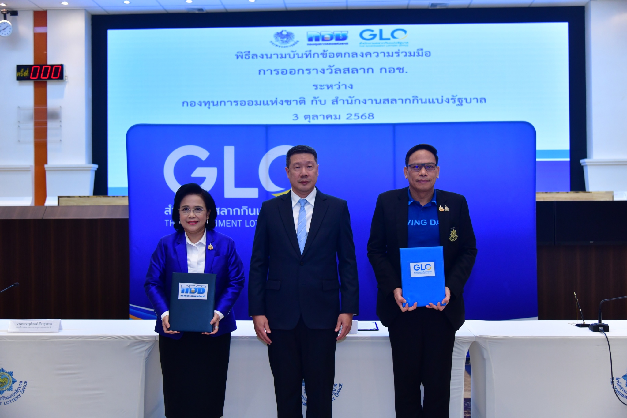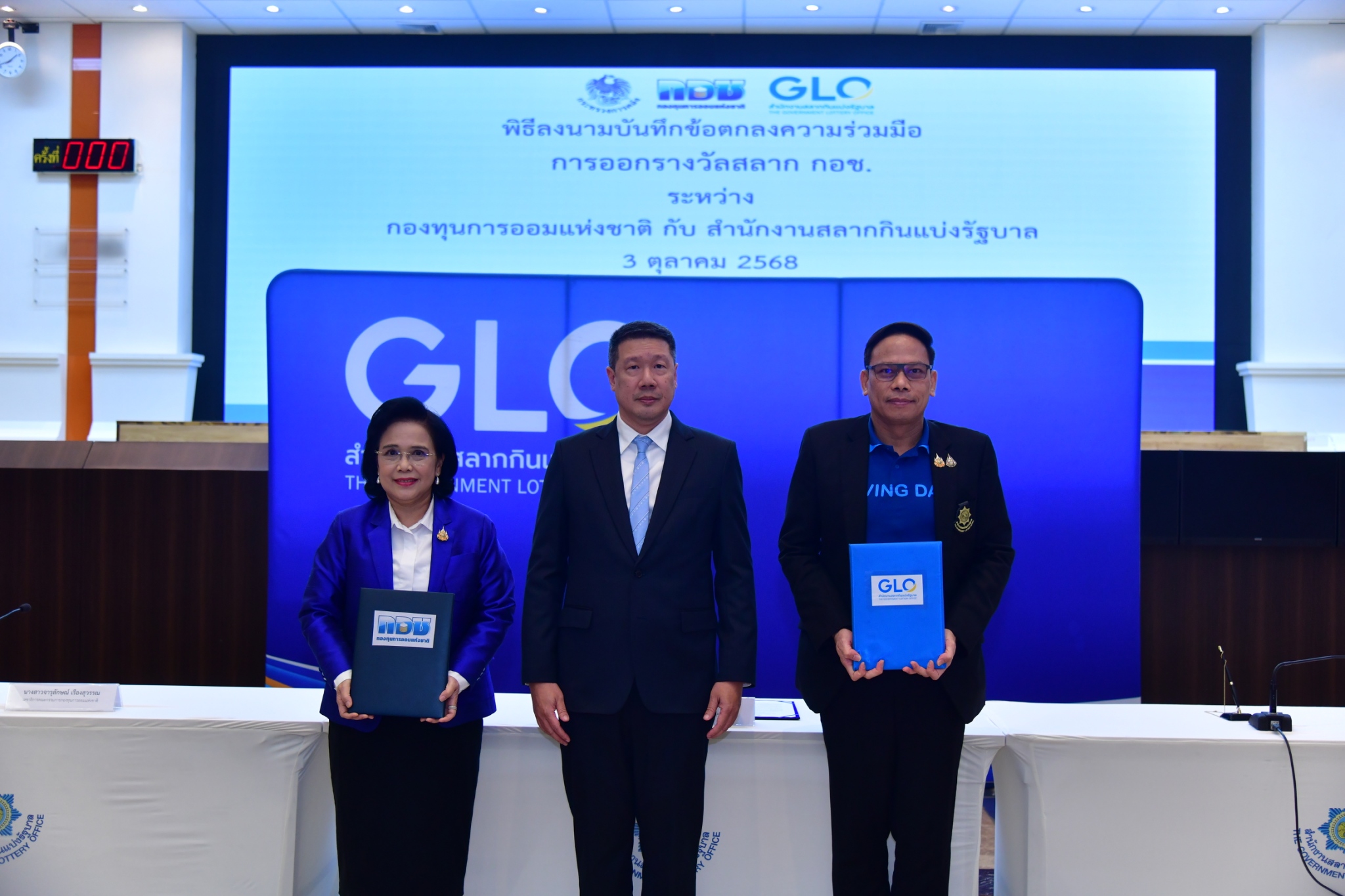 วันที่ 3 ตุลาคม 2568 ที่สำนักงานสลากกินแบ่งรัฐบาล ได้มีการจัดพิธีลงนามบันทึกข้อตกลงความร่วมมือ (MOU) การออกรางวัล “สลาก กอช.” ระหว่างกองทุนการออมแห่งชาติ (กอช.)โดยนางสาวจารุลักษณ์ เรืองสุวรรณ เลขาธิการคณะกรรมการกองทุนการออมแห่งชาติ และสำนักงานสลากกินแบ่งรัฐบาล (GLO) โดย พันโท หนุน ศันสนาคม ผู้อำนวยการสำนักงานสลากกินแบ่งรัฐบาล