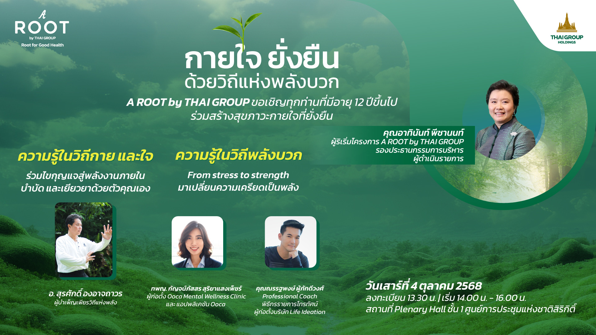 A ROOT By Thai Group ขอเชิญผู้สนใจสร้างสุขภาวะที่ดีอย่างยั่งยืน เข้าร่วมงาน “กายใจ ยั่งยืน ด้วยวิถีแห่งพลังบวก” เรียนรู้การดูแลสุขภาพ พร้อมเปลี่ยนความเครียดให้เป็นพลัง เสริมสร้างกายใจให้แข็งแรงและยั่งยืนไปด้วยกัน โดยนางอาทินันท์ พีชานนท์ รองประธานกรรมการบริหาร บริษัท ไทยกรุ๊ป โฮลดิ้งส์ จำกัด (มหาชน) ให้เกียรติร่วมพูดคุยกับวิทยากรผู้เชี่ยวชาญเพื่อสร้างแรงบันดาลใจและเปิดมุมมองใหม่ในการดูแลสุขภาพ เริ่มด้วย “ความรู้ในวิถีกาย และใจ” ที่จะมาร่วมไขกุญแจสู่พลังงานภายใน บำบัด และเยียวยาด้วยตัวคุณเอง โดยอาจารย์สุรศักดิ์ องอาจถาวร ต่อด้วยหัวข้อ “ความรู้ในวิถีพลังบวก” From stress to strength เปลี่ยนความเครียดให้เป็นพลัง โดย ทพญ.กัญจน์ภัสสร สุริยาแสงเพ็ชร์ ผู้ก่อตั้ง Ooca Mental Wellness Clinic และคุณณรรฐพงษ์ ผู้ภักดีวงศ์ Professional Coach พิธีกรรายการโทรทัศน์ ผู้ก่อตั้งบริษัท Life Ideation ในวันเสาร์ที่ 4 ตุลาคม 2568 เวลา 14.00 – 16.00 น. ณ Plenary Hall ชั้น 1 ศูนย์การประชุมแห่งชาติสิริกิติ์ ผู้ที่สนใจสามารถ Scan ลงทะเบียนร่วมกิจกรรมได้ฟรี โดยไม่มีค่าใช้จ่าย
