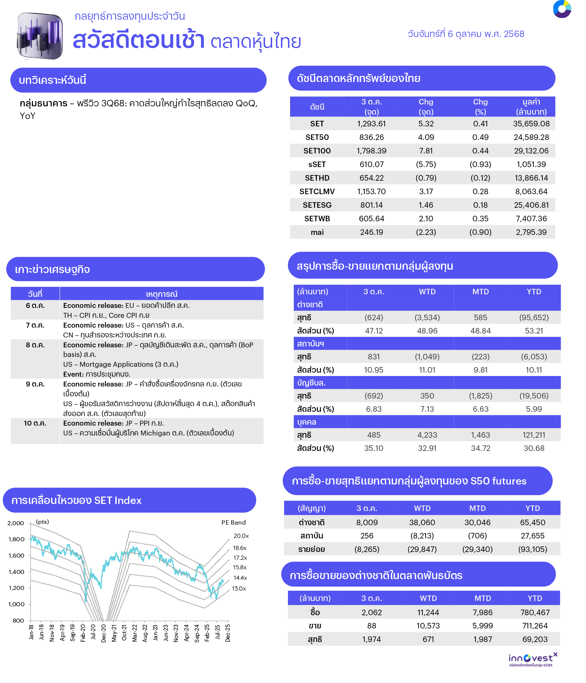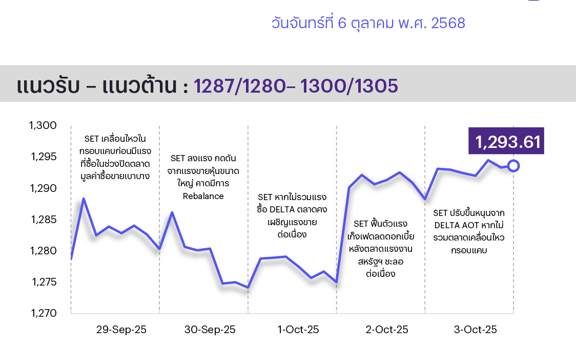 คาดตลาดแกว่งไซด์เวย์ วันศุกร์ NPF สหรัฐฯ ไม่สามารถประกาศได้ แต่ ISM Services PMI ที่ต่ำยังชี้นำ ศก. สหรัฐฯ ที่ชะลอ วันนี้ติดตามเงินเฟ้อไทย คาดลดลงต่อเป็นเดือนที่หก หากยังต่ำจะหนุนความหวังในการลดดอกเบี้ย อย่างไรก็ตามเราคาดว่าโอกาสการลดดอกเบี้ย กนง. ใน ธ.ค. มีโอกาสสูงกว่า รวมถึงการแถลงมาตรการสร้างเสน่ห์ตลาดทุนไทย ทางเทคนิคตลาดพยายามยืนเหนือ 1293 ยืนได้แกว่งขึ้น แต่ต้องระวังการชะลอตัวที่ 1300/1305 ขึ้นต่อไม่ควรหลุดแนวรับ