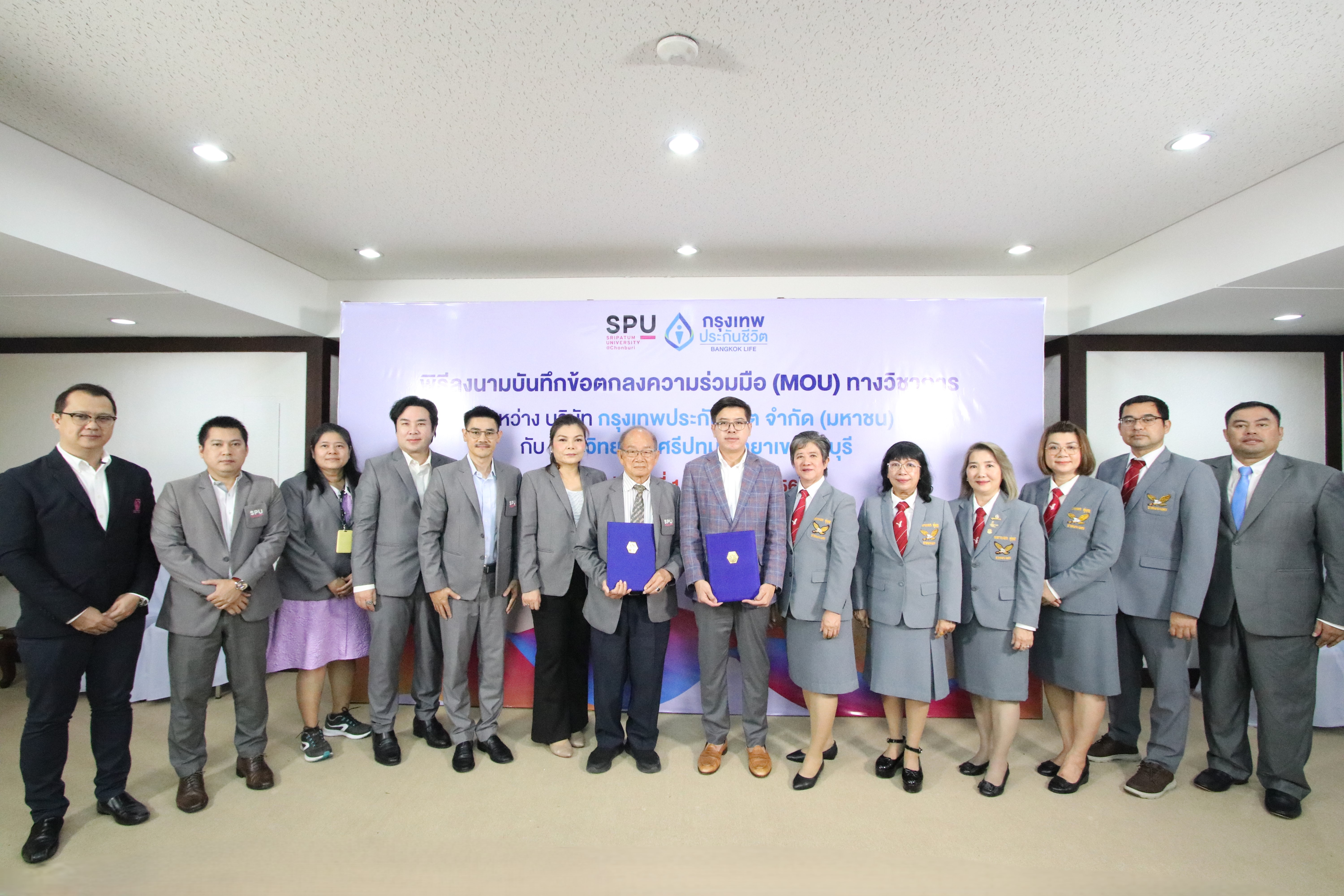 บริษัท กรุงเทพประกันชีวิต จำกัด (มหาชน) นำโดย นายจักรพงศ์ แสงแก้ว ผู้ช่วยผู้จัดการใหญ่ สายงานตัวแทนและที่ปรึกษาทางการเงิน (ที่ 8 จากซ้าย) ลงนามบันทึกข้อตกลงความร่วมมือ (MOU) ทางวิชาการกับ มหาวิทยาลัยศรีปทุม วิทยาเขตชลบุรี โดย ผู้ช่วยศาสตราจารย์ ดร.สุเทพ อุสาหะ ผู้ช่วยอธิการบดี มหาวิทยาลัยศรีปทุม วิทยาเขตชลบุรี (ที่ 7 จากซ้าย) ในโครงการ Mini MBA Certified BLA & SPUC Leader 2025: Entrepreneurial Leaders of the New Era Transform Your Leadership, Transform Your Future โดยมีผู้บริหารฝ่ายขายระดับสูง ภาคตะวันออก ร่วมเป็นสักขีพยาน ซึ่งการลงนามบันทึกข้อตกลงในครั้งนี้ จัดทำขึ้นเพื่อพัฒนาศักยภาพผู้บริหารตัวแทนให้มีทักษะเชิงผู้ประกอบการ ตลอดจนการเสริมสร้างองค์ความรู้ด้านการบริหารธุรกิจและภาวะผู้นำ สร้างแนวคิดเชิงนวัตกรรมและการบริหารจัดการอย่างยั่งยืน โดยมุ่งเน้นความสำคัญของการพัฒนาทักษะเชิงผู้ประกอบการ ภาวะผู้นำ และการใช้เทคโนโลยี AI ในการเสริมสร้างศักยภาพผู้บริหารตัวแทนให้เป็นเจ้าของกิจการที่สามารถขับเคลื่อนธุรกิจประกันชีวิตได้อย่างยั่งยืน ณ มหาวิทยาลัยศรีปทุม วิทยาเขตชลบุรี เมื่อเร็วๆ นี้