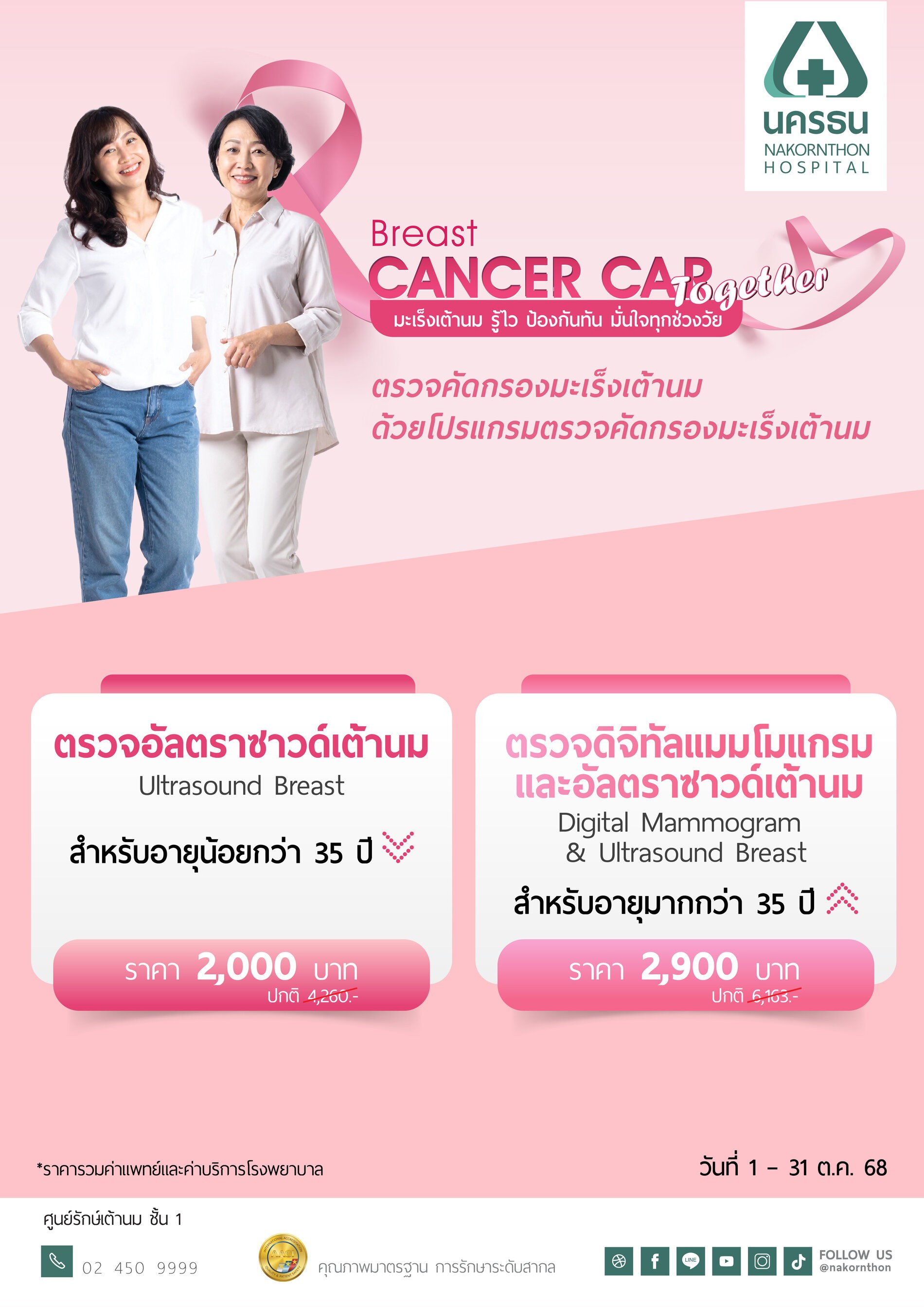 ทั้งนี้ เพื่อรณรงค์วันมะเร็งเต้านมโลก ซึ่งตรงกับวันที่ 7 ตุลาคมของทุกปี โรงพยาบาลนครธน ได้จัดโปรแกรมตรวจคัดกรองมะเร็งเต้านม 1. ตรวจอัลตราซาวด์เต้านม ราคา 1,900 บาท 2. ตรวจด้วยเครื่องดิจิทัลแมมโมแกรมและอัลตราซาวด์เต้านม ราคา 2,900 บาท เปิดให้สั่งซื้อผ่านเว็บไซต์ www.nakornthon.com ตั้งแต่วันที่ 1 – 31 ตุลาคม 2568