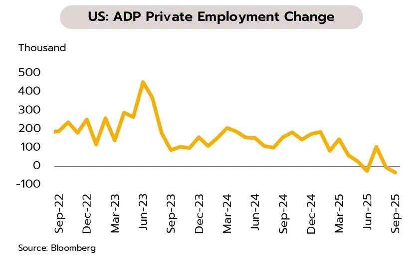 การปิดหน่วยงานราชการกระทบความเชื่อมั่น ขณะที่ข้อมูลล่าสุดยังคงสะท้อนภาพการชะลอตัวของเศรษฐกิจสหรัฐฯ โดยการจ้างงานภาคเอกชนลดลง 32,000 ตำแหน่ง ในเดือนกันยายน ซึ่งย่ำแย่สุดในรอบกว่า 2 ปีครึ่ง ส่วนความเชื่อมั่นผู้บริโภคลดลงสู่ระดับต่ำสุดในรอบ 5 เดือนที่ 94.2 ขณะที่ผลจากการปิดหน่วยงานรัฐบาลของสหรัฐฯ ทำให้ต้องเลื่อนการรายงานตัวเลขจ้างงานนอกภาคเกษตรในเดือนกันยายนออกไปชั่วคราว