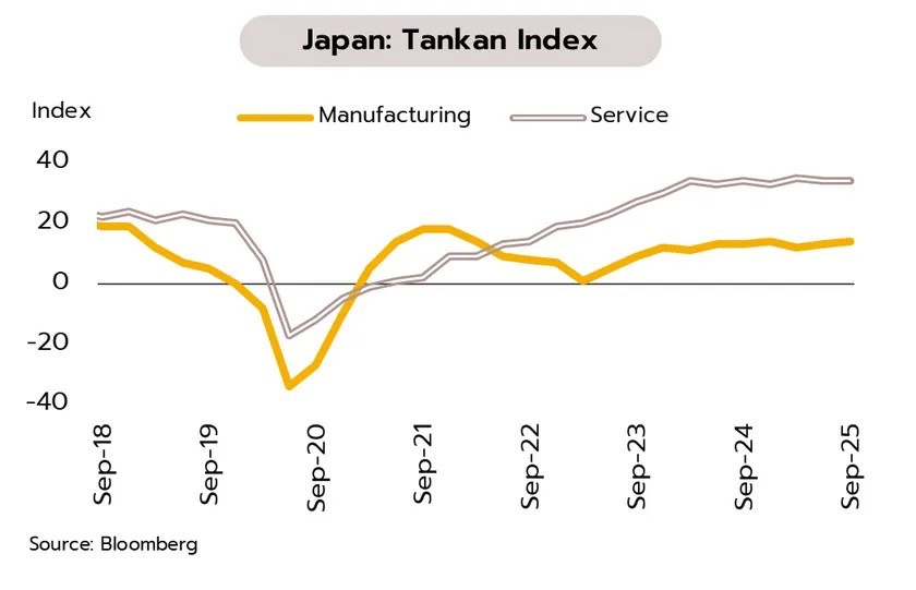 แรงขับเคลื่อนทางเศรษฐกิจของญี่ปุ่นยังคงอ่อนแอ ขณะที่ การเลือกตั้งผู้นำพรรค LDP เพิ่มความหวังต่อมาตรการกระตุ้นเศรษฐกิจ ดัชนีความเชื่อมั่นของผู้ผลิตรายใหญ่เพิ่มขึ้นเพียงเล็กน้อยสู่ +14 ในไตรมาส 3 จาก +13 ในไตรมาส 2 ส่วนภาคบริการทรงตัวที่ระดับ +34 อย่างไรก็ตาม ผู้ผลิตรายใหญ่มีแผนเพิ่มการใช้จ่ายเพื่อการลงทุน 12.5% YoY สูงสุดในรอบ 7 ไตรมาส ขณะที่ยอดค้าปลีกหดตัว -1.1% YoY ในเดือนสิงหาคม จากเดือนก่อนขยายตัว +0.4% นอกจากนี้ ซานาเอะ ทาคาอิจิ ได้รับเลือกเป็นผู้นำพรรค LDP คนใหม่ ปูทางสู่นายกรัฐมนตรีหญิงคนแรกของญี่ปุ่น