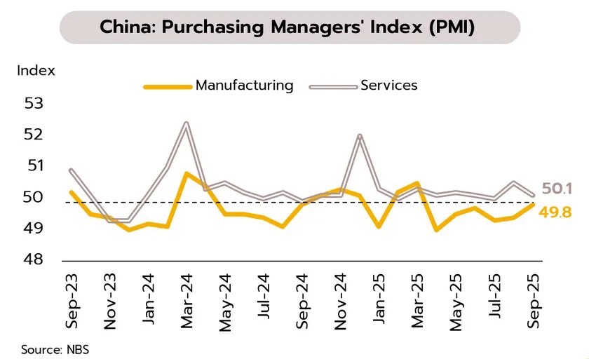 ภาคบริการยังหนุนเศรษฐกิจจีนต่อเนื่อง และคาดว่าจะมีความสำคัญมากขึ้นภายหลังรัฐบาลขยายมาตรการหนุนการบริโภคภาคบริการเพิ่มเติมในเดือนกันยายน สำหรับภาคการผลิตเดือนล่าสุดเริ่มดีขึ้นบ้าง แต่ยังเผชิญแรงกดดันหลายด้านจากทั้งภาวะอุปทานส่วนเกิน การบริโภคที่อ่อนแอ และนโยบายภาษีนำเข้าของสหรัฐฯ นอกจากนี้ ภาคอสังหาริมทรัพย์โดยพื้นฐานยังคงอ่อนแอ และอุปสงค์บ้านใหม่มีแนวโน้มลดลงในระยะยาวตามโครงสร้างประชากรที่หดตัวลง ขณะที่วันหยุดยาวในช่วงเฉลิมฉลองวันชาติจีนคาดว่าจะช่วยให้เศรษฐกิจในเดือนตุลาคมคึกคักมากขึ้น โดยรัฐบาลประเมินว่าการเดินทางทั่วประเทศจะสูงขึ้น 3.2% YoY สู่ระดับ 2.4 พันล้านทริป