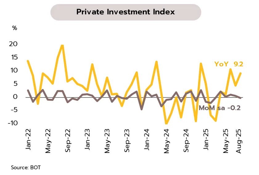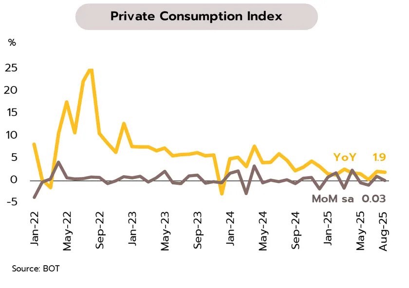 เศรษฐกิจไทยมีสัญญาณอ่อนแอลงชัดเจน คาดหนุนให้ธปท.ปรับลดดอกเบี้ย ธนาคารแห่งประเทศไทย (ธปท.) รายงานเศรษฐกิจโดยรวมในเดือนสิงหาคม มูลค่าการส่งออกสินค้าไม่รวมทองคำลดลงจากเดือนก่อน (-0.1% MoM sa) โดยการส่งออกไปสหรัฐฯลดลงเป็นเดือนแรกหลังภาษีนำเข้ามีผลบังคับใช้ตั้งแต่วันที่ 7 สิงหาคม ด้านการลงทุนภาคเอกชนหดตัว (-0.2%) จากการลดลงในหมวดเครื่องจักรและอุปกรณ์ และการบริโภคภาคเอกชนไม่มีการเติบโต (0%) โดยเฉพาะการใช้จ่ายในหมวดสินค้าคงทนและหมวดสินค้ากึ่งคงทนที่ลดลงจากเดือนก่อน อย่างไรก็ตามจำนวนนักท่องเที่ยวต่างชาติและรายรับที่ขจัดปัจจัยฤดูกาลเพิ่มขึ้นจากเดือนก่อน (+2.8% และ +2.7% ตามลำดับ)