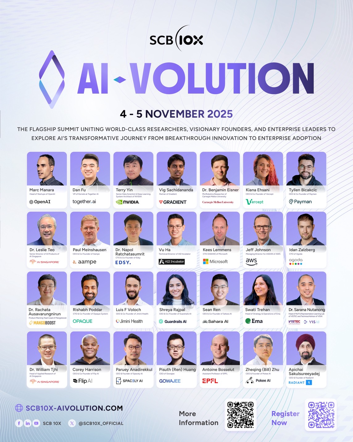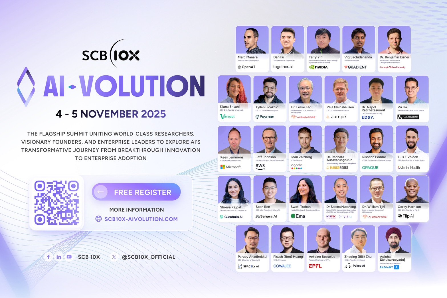 เอสซีบี เท็นเอกซ์ (SCB 10X) บริษัทด้านการลงทุนในเทคโนโลยีเปลี่ยนโลก (Disruptive Technology) ภายใต้กลุ่มเอสซีบีเอกซ์ (SCBX Group) ประกาศจัดงานสัมมนาออนไลน์ระดับโลกด้าน AI เป็นครั้งแรก ภายใต้ชื่อ “AI-VOLUTION” ระหว่างวันที่ 4-5 พฤศจิกายน 2568 เวลา 08.00-16.00 น. (ตามเวลาประเทศไทย) เปิดให้ผู้สนใจจากทั่วโลกเข้าร่วมรับชมฟรีผ่านระบบออนไลน์