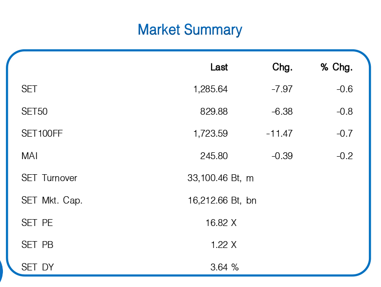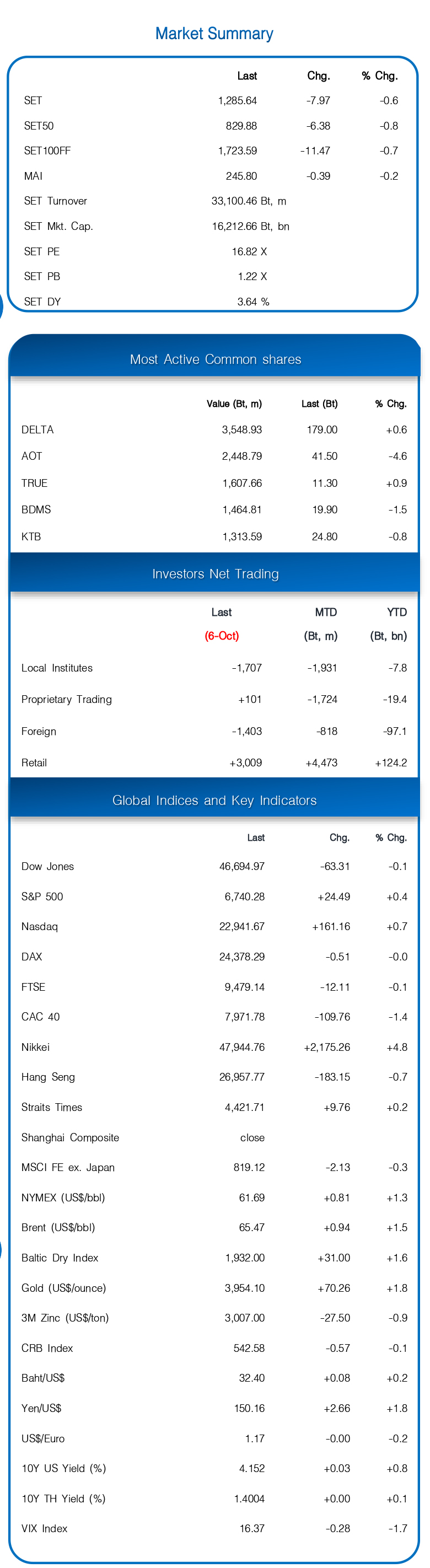 ถอยตั้งหลักใหม่ – SET แกว่งอิงแดนลบในกรอบ 1285-99 เทรดเพียง 3.3 หมื่นลบ. ต่ำสุดในรอบ 2 สัปดาห์ ตลาดขาดปัจจัยใหม่และหุ้นภูมิภาคปิดในวันไหว้พระจันทร์ มีแรงขายหุ้นขนาดใหญ่ทั้ง AOT และ THAI รวมทั้ง TTB และ SAWAD ขึ้น XD ต่างชาติขายสุทธิ 1.4 พันลบ. 3 วันติด และพลิก Short S50 Futures 10,983 สัญญา