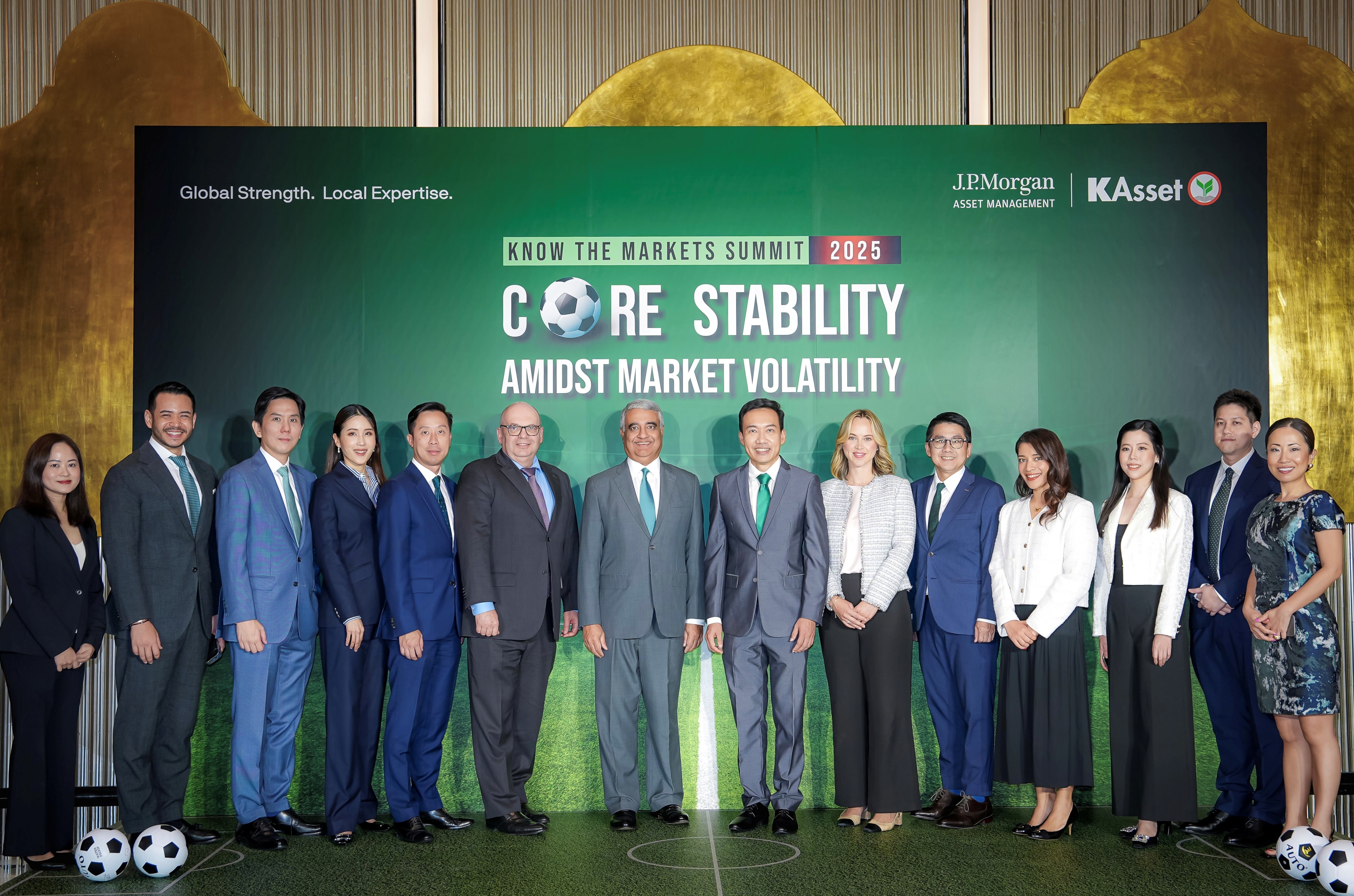 บริษัทหลักทรัพย์จัดการกองทุน กสิกรไทย จำกัด (บลจ.กสิกรไทย) ร่วมกับพันธมิตรระดับโลก J.P. Morgan Asset Management จัดงานสัมมนาการลงทุนสุดยิ่งใหญ่แห่งปี “Know The Markets Summit 2025: Core Stability Amidst Market Volatility” โดยได้รับเกียรติจาก Mr. Ayaz Ebrahim CEO for Singapore and Southeast Asia, J.P. Morgan Asset Management (ที่ 7 จากซ้าย) และนายวิน พรหมแพทย์, CFA ประธานกรรมการบริหาร บลจ.กสิกรไทย (ที่ 7 จากขวา) นำทีมผู้เชี่ยวชาญด้านการลงทุนจากทั้ง 2 บริษัท มาร่วมถ่ายทอดมุมมองเศรษฐกิจและกลยุทธ์การลงทุนสำหรับปี 2026 เพื่อเสริมสร้างความมั่นใจให้กับผู้ลงทุนไทยในการเตรียมรับมือกับความไม่แน่นอนของเศรษฐกิจโลก