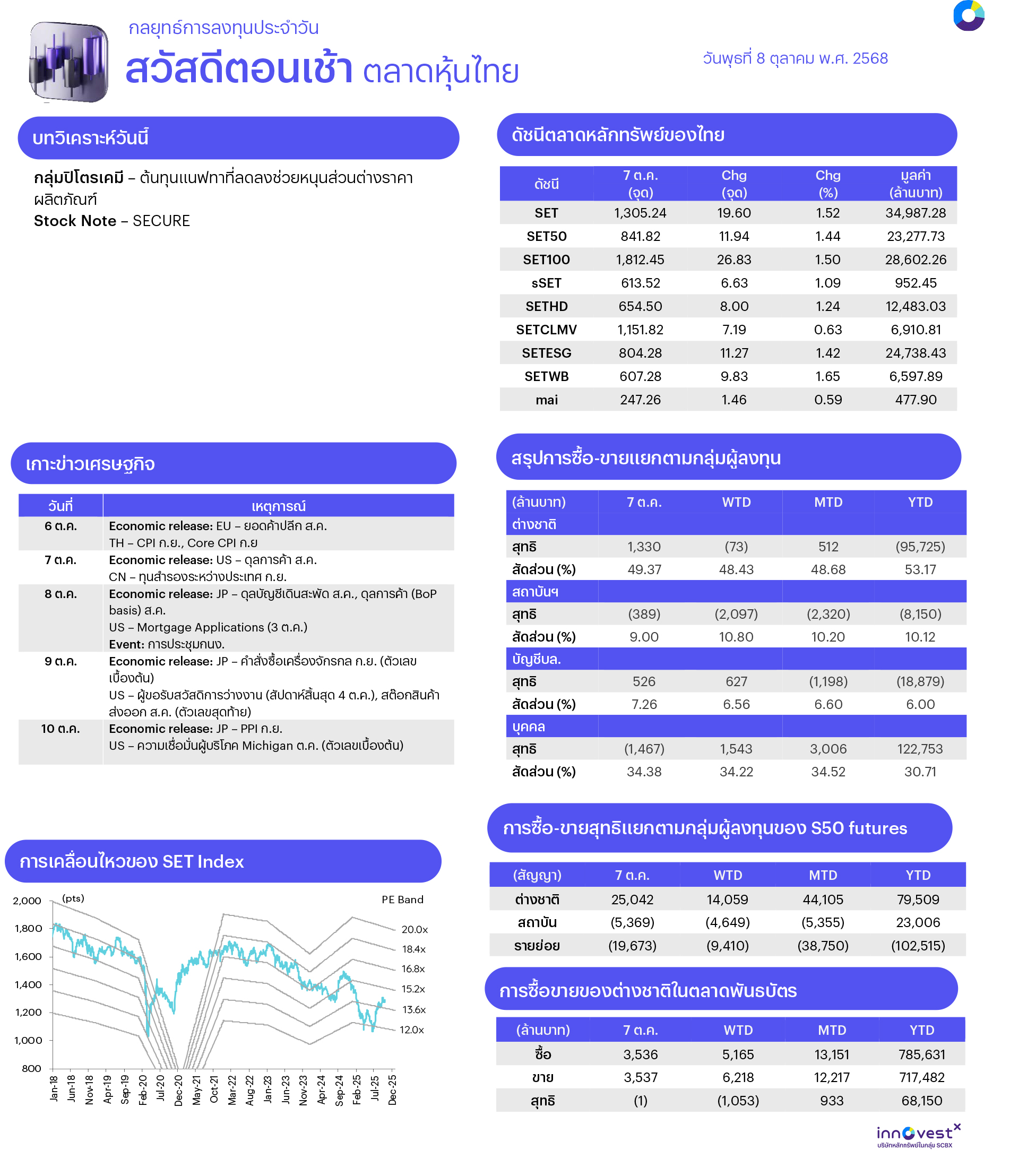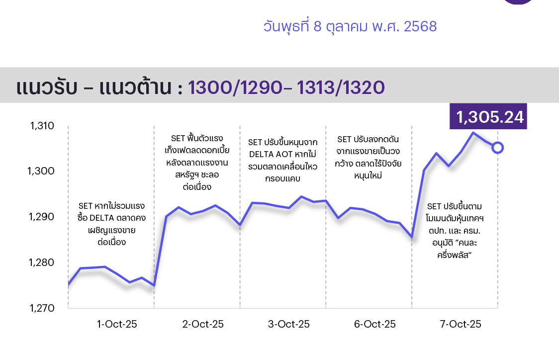 คาดตลาดแกว่งไซด์เวย์ ตลาดมายืนเหนือ 1300 แรงซื้อหลักมาจาก DELTA หนุนตลาด 10 จุด หนุนจิตวิทยาก่อนทราบผลประชุม กนง. วันนี้ ตลาดส่วนหนึ่งคาดว่า กนง. จะลดดอกเบี้ย แต่เรามองว่าการปรับลดมีแนวโน้มเกิดขึ้นใน ธ.ค. มากกว่า หากออกมาตามที่เราคาดไว้อาจทำให้ตลาดมีช่วงผันผวนได้ ทางเทคนิคตลาดกลับมายืนเหนือ 1300 ได้ ทำให้จิตวิทยาเป็นบวกอีกครั้ง มีแนวต้านถัดไปที่ 1313/1320 ที่จะทำให้ชะลอตัว ส่วนแนวรับหากยังบวกแกว่งไม่ควรลงหลุด 1300/1290