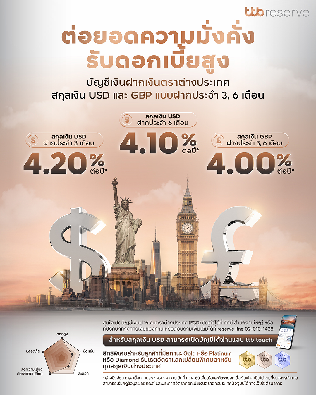 นอกจากนี้ สำหรับลูกค้าที่ต้องการต่อยอดความมั่งคั่งด้วยการรับดอกเบี้ยสูง ทีทีบียังได้มีการปรับอัตราดอกเบี้ยในบัญชีเงินฝากสกุลเงินต่างประเทศในรูปแบบฝากประจำ โดยมีอัตราดอกเบี้ย ณ วันที่ 1 ตุลาคม 2568 ดังนี้