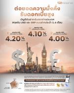 • สกุลเงินดอลลาร์สหรัฐ (USD) รับดอกเบี้ยสูงถึง 4.00 % ต่อปี (จากอัตราดอกเบี้ยปกติ 2.10% ต่อปี ตามประกาศธนาคาร ณ วันที่ 1 ต.ค.68)