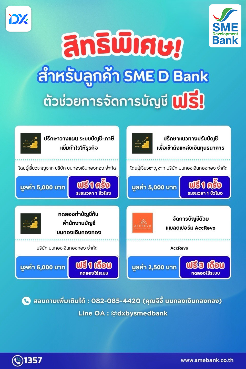 ธนาคารพัฒนาวิสาหกิจขนาดกลางและขนาดย่อมแห่งประเทศไทย (ธพว.) หรือ SME D Bank เดินหน้าเติมเต็มความรู้ด้านการเงิน (Financial Literacy) โดยเฉพาะด้านวางแผนภาษี และการจัดทำบัญชี ให้แก่ผู้ประกอบการเอสเอ็มอี ซึ่งมีความสำคัญอย่างยิ่ง ช่วยสร้างประโยชน์เข้าสู่ระบบภาษีอย่างถูกต้องตามนโยบายรัฐบาล รวมถึง สร้างความน่าเชื่อถือและลดต้นทุนให้ธุรกิจ อีกทั้ง เปิดโอกาสเข้าถึงแหล่งเงินทุนจากสถาบันการเงิน ด้วยการมอบสิทธิประโยชน์มากมาย เพียงสมัครเป็นสมาชิกแพลตฟอร์ม “DX by SME D Bank” (dx.smebank.co.th) บริการพัฒนาธุรกิจครบวงจร ใช้งานง่าย สะดวกทุกที ทุกเวลา ตลอด 24 ชั่วโมง โดยมีสิทธิ์ประโยชน์ต่าง ๆ มากมาย เช่น เข้าพบที่ปรึกษาวางแผนภาษีธุรกิจแบบส่วนตัว จากผู้เชี่ยวชาญ บริษัท บนกองเงินกองทอง จำกัด รูปแบบออนไลน์ ฟรี 1 ครั้ง (มูลค่า 5,000 บาท) หรือแลกสิทธิ์ใช้งานระบบบัญชีออนไลน์ Accrevo ฟรี 3 เดือน (มูลค่า 2,500 บาท) เป็นต้น รวมถึง E-Learning รวบรวมหลักสูตรความรู้ด้านการเงินอีกมากมาย