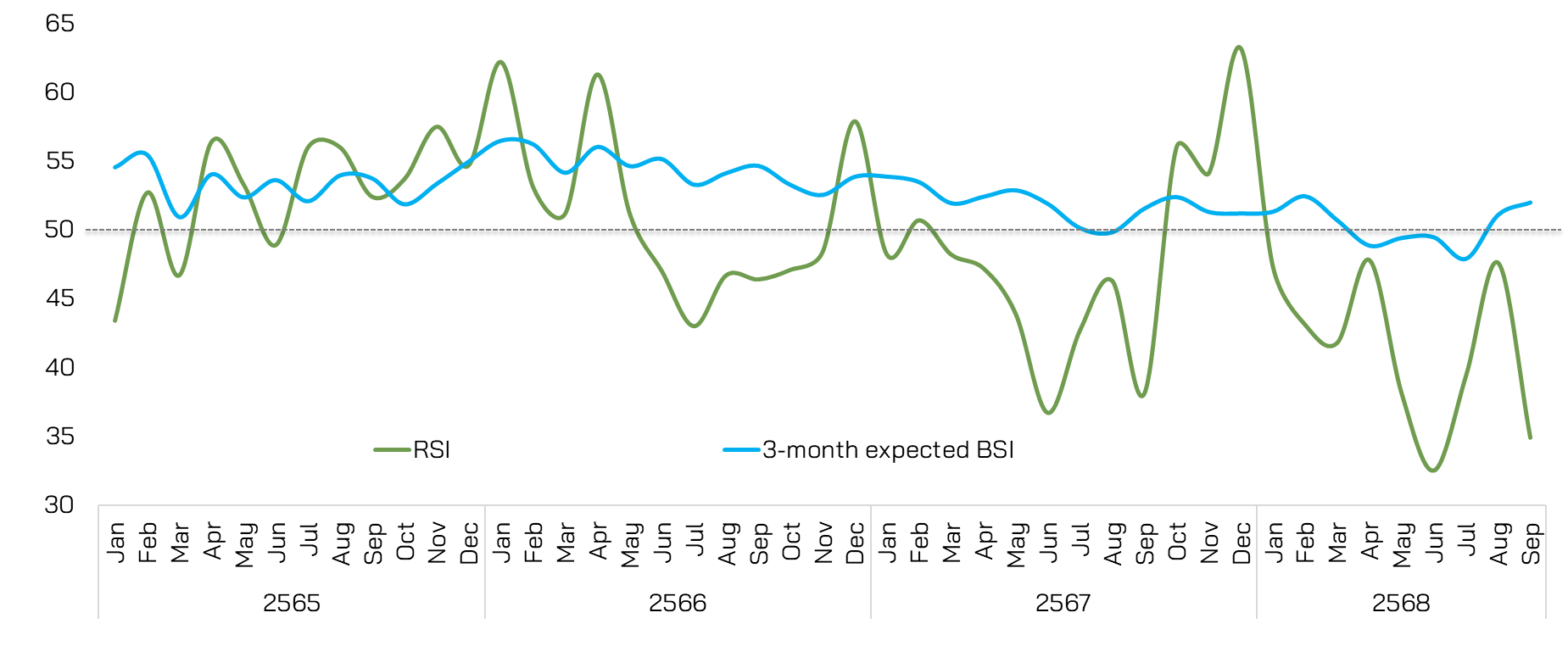 · กำลังซื้อของผู้บริโภคยังไม่ฟื้นตัว สะท้อนจากดัชนีความเชื่อมั่นผู้ประกอบการค้าปลีก (RSI) เดือนกันยายน ยังคงอยู่ที่ระดับต่ำกว่า 50 ต่อเนื่องติดต่อกันเป็นเดือนที่ 9 ของปีนี้ ขณะที่ดัชนีความเชื่อมั่นธุรกิจในอีก 3 เดือนข้างหน้า (BSI) แม้ว่าจะขยับขึ้นมาเกินที่ระดับ 50 เพียงเล็กน้อย แต่ก็ยังถือว่าต่ำกว่าปีก่อน (รูปที่ 3) บ่งชี้ถึงความไม่เชื่อมั่นทางด้านเศรษฐกิจและกำลังซื้อของผู้บริโภคที่ยังมีอยู่