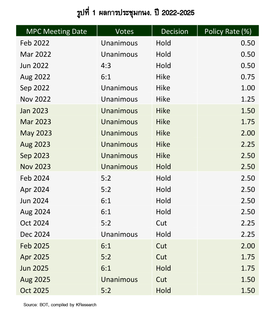 ในการประชุมกนง. วันที่ 8 ต.ค. 2568 ที่ผ่านมา กนง. มีมติไม่เป็นเอกฉันท์ 5 ต่อ 2 เสียงให้คงดอกเบี้ยนโยบายที่ 1.50% ตามที่ศูนย์วิจัยกสิกรไทยคาดไว้ก่อนหน้านี้ โดย 2 เสียงเห็นควรให้ปรับลดดอกเบี้ยนโยบาย 0.25% เพื่อสนับสนุนเศรษฐกิจและบรรเทาภาระหนี้ โดยมีรายละเอียดดังต่อไปนี้