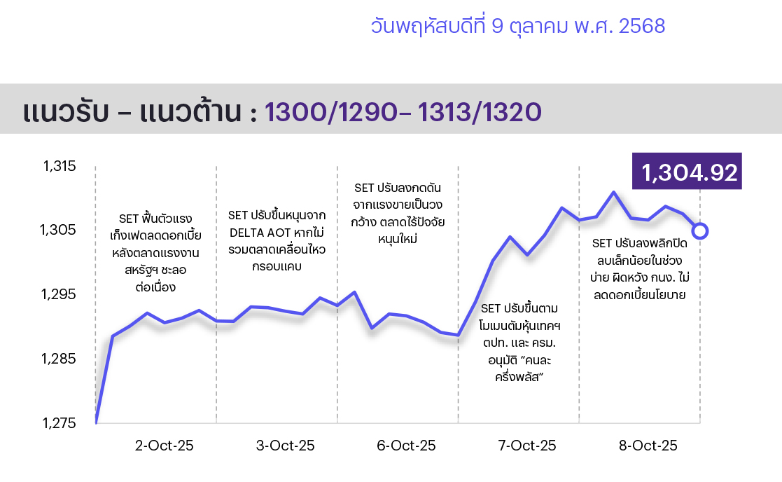 คาดตลาดแกว่งไซด์เวย์/แกว่งขึ้น ตลาดมีช่วงผันผวนหลังกนง. คงดอกเบี้ย แต่ยังไม่หลุด 1300 เป็นสัญญาณบวก แรงซื้อหลักยังมาจาก DELTA ระยะสั้นติดตามการทยอยออกมาตรการกระตุ้นเศรษฐกิจเพิ่ม ซึ่ง รมว.คลังคาดจะออกมาตรการทุกสัปดาห์ ทางเทคนิค ตลาดชะลอตัวที่แนวต้านที่ให้ไว้ 1313 แต่การลงก็ยังไม่หลุดต่ำกว่า 1300 หากไม่หลุดต่ำกว่าระยะสั้นยังแกว่งขึ้น โดยมีแนวต้าน 1313/1320 ส่วนแนวรับอยู่ที่ 1300/1290 ยังแกว่งขึ้นไม่ควรลงหลุดต่ำกว่านื้1300 ได้ ทำให้จิตวิทยาเป็นบวกอีกครั้ง มีแนวต้านถัดไปที่ 1313/1320 ที่จะทำให้ชะลอตัว ส่วนแนวรับหากยังบวกแกว่งไม่ควรลงหลุด 1300/1290