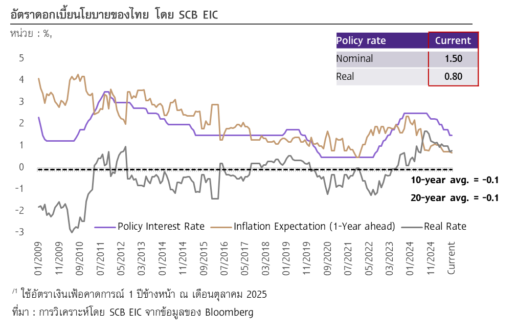 สำหรับมุมมองนโยบายการเงินในระยะข้างหน้า SCB EIC ยังคงประเมินว่า อัตราดอกเบี้ยนโยบายจะปรับลดลงมาอยู่ที่ 1.25% ในการประชุมเดือน ธ.ค. นี้ และปรับลดอีกครั้งในช่วงต้นปี 2026 ลงมาอยู่ที่ 1.0% โดยแนวโน้มเศรษฐกิจไทยจะยังชะลอลงอย่างต่อเนื่องจนถึงครึ่งแรกของปี 2026 เนื่องจากความเปราะบางของภาคธุรกิจและครัวเรือนจะยังส่งผลกดดันอุปสงค์ในประเทศอย่างต่อเนื่อง อีกทั้ง ภาวะการเงินไทยยังนับว่ายังตึงตัวสูง ไม่สอดคล้องกับอัตราการขยายตัวของเศรษฐกิจไทยที่ต่ำกว่าระดับศักยภาพมาก SCB EIC จึงประเมินว่า กนง. จะปรับลดอัตราดอกเบี้ยนโยบายอีกครั้งในการประชุมเดือนธันวาคมนี้ และอีก 1 ครั้งในช่วงต้นปีหน้า เพื่อให้นโยบายการเงินช่วยลดความเปราะบางของเศรษฐกิจไทยในระยะข้างหน้าได้