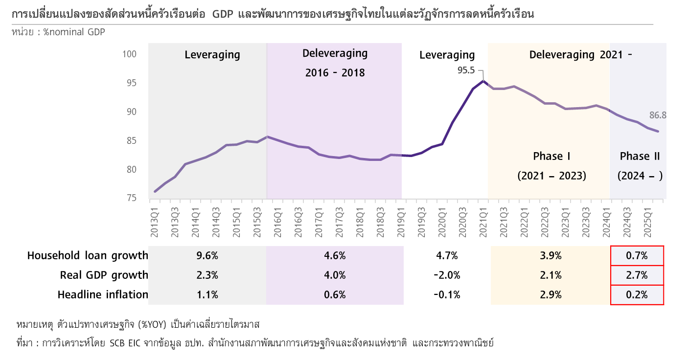 ภาระหนี้ครัวเรือนไทยยังคงสูงอยู่ โดยในช่วงที่เห็นกระบวนการลดหนี้ครัวเรือน (Debt deleveraging) ตั้งแต่ต้นปี 2024 มานี้ อัตราเงินเฟ้อทั่วไปเฉลี่ยเพียง 0.2% (รูปที่ 5) ต่ำกว่ารอบกระบวนการลดหนี้ครัวเรือนครั้งก่อน ๆ โดยอัตราเงินเฟ้อต่ำไม่ได้ช่วยในกระบวนการลดหนี้ครัวเรือนมากนัก เนื่องจากมูลค่าของเงินยังคงเดิม มูลค่าหนี้ที่แท้จริงจึงไม่ได้ปรับลดลงไป