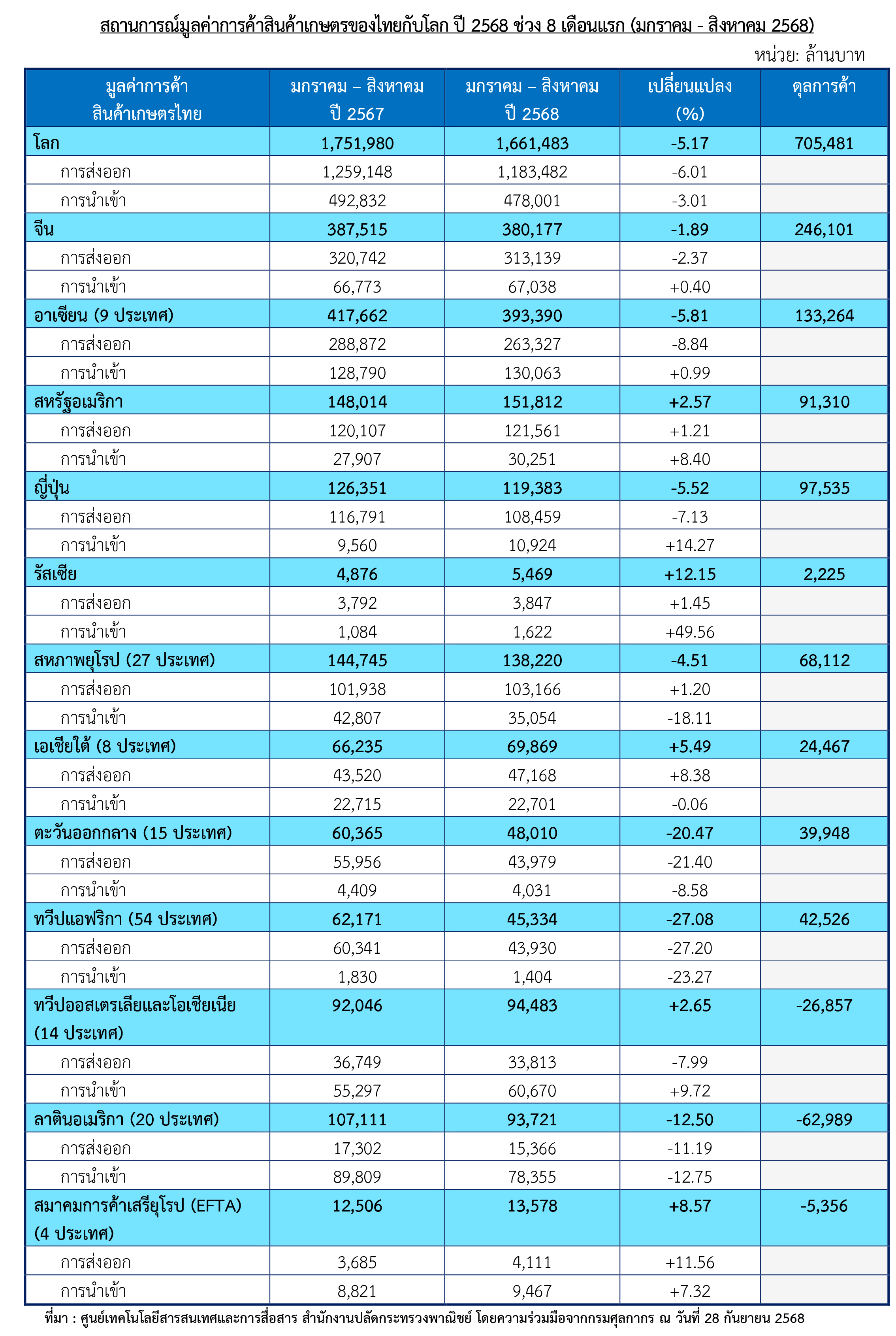 นายฉันทานนท์ วรรณเขจร เลขาธิการสำนักงานเศรษฐกิจการเกษตร (สศก.) เปิดเผยถึงสถานการณ์การค้าสินค้าเกษตรของไทยกับโลกในช่วง 8 เดือนแรกของปี 2568 (มกราคม - สิงหาคม 2568) พบว่า ไทยมีมูลค่าการค้าสินค้าเกษตร (พิกัด 01-24 รวมยางพารา พิกัด 4001) รวมทั้งสิ้น 1,661,483 ล้านบาท ซึ่งหดตัวร้อยละ 5.17 เมื่อเทียบกับช่วงเดียวกันของปีก่อน โดยแบ่งเป็นมูลค่าการส่งออก 1,183,482 ล้านบาท หดตัวร้อยละ 6.01 และการนำเข้ามูลค่า 478,001 ล้านบาท หดตัวร้อยละ 3.01 อย่างไรก็ตาม แม้มูลค่าการค้าจะหดตัว แต่ประเทศไทยยังคงเกินดุลการค้าสินค้าเกษตรถึง 705,481 ล้านบาท ซึ่งแสดงให้เห็นถึงศักยภาพการแข่งขันของสินค้าเกษตรไทยในตลาดโลก