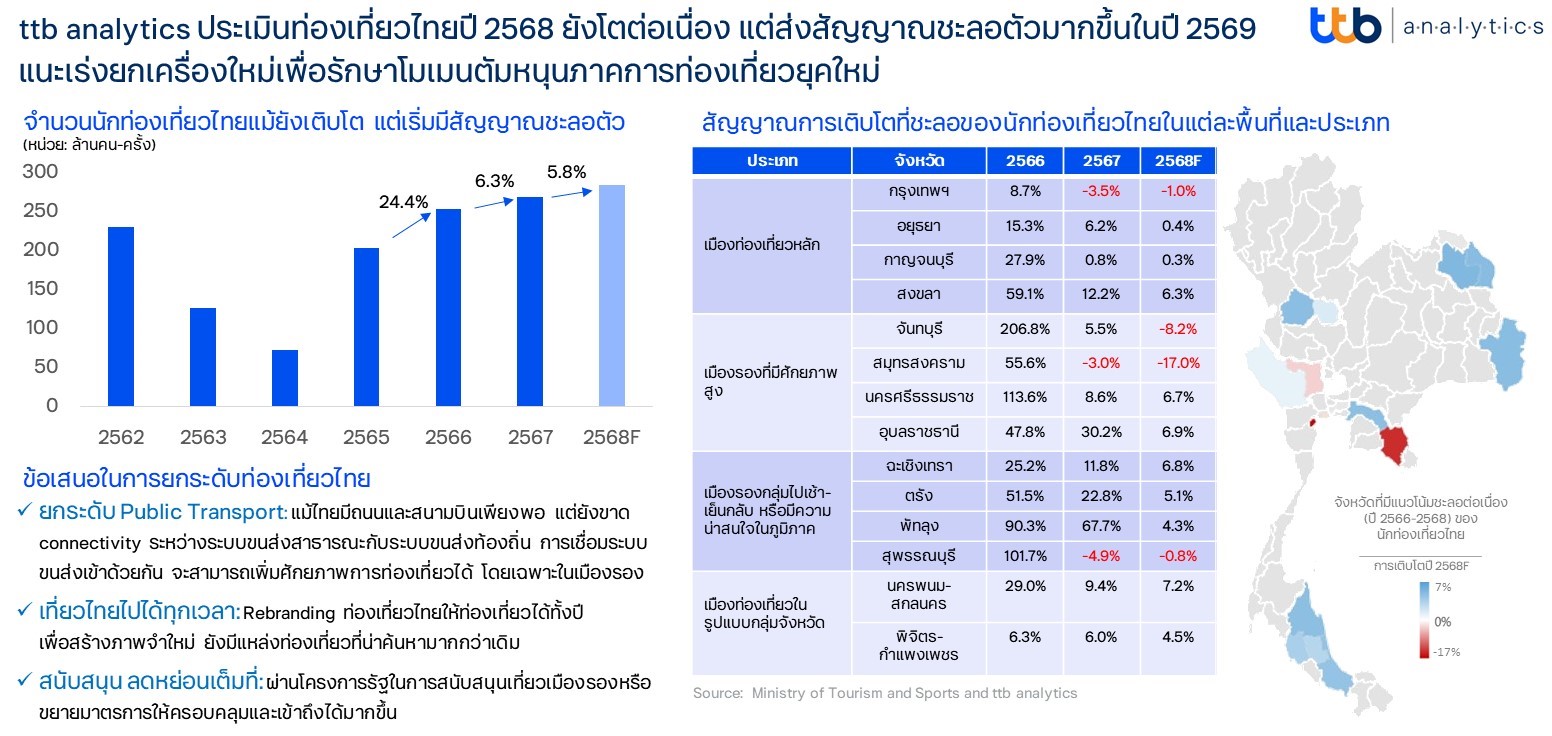 การท่องเที่ยวในประเทศของนักท่องเที่ยวไทยในช่วง 2-3 ปีที่ผ่านมานับเป็นยุคทองของการท่องเที่ยว จากอานิสงส์ของโครงสร้างอายุของประชากรวัยท่องเที่ยว (25 ปี - 65 ปี) ที่นับว่ายังสามารถส่งผลบวกให้กับภาคการท่องเที่ยวในประเทศได้เป็นอย่างดี แต่อย่างไรก็ตาม สัญญาณการท่องเที่ยวที่เคยเป็นจุดหนุนทั้งในรูปแบบ 1) กลุ่มเมืองท่องเที่ยวหลักในแต่ละภูมิภาคที่ปกติมีนักท่องเที่ยวเกินกว่า 4 ล้านคน / ครั้ง / ต่อปี เช่น จังหวัดพระนครศรีอยุธยา ปี 2566 เติบโตดีที่ 15.3% แต่เริ่มชะลอในปี 2567 ที่ 6.2% และปี 2568 การเติบโตของนักท่องเที่ยวกลับเหลือเพียง 0.4% หรือเมืองหลักในภูมิภาคอื่น ๆ อาทิ สงขลาเติบโต 59.1% ในปี 2566 และเริ่มชะลอลง 12.2% และ 6.3% ในปี 2567 และ 2568 ตามลำดับ 2) กลุ่มเมืองรองที่มีศักยภาพสูงเพียงพอดึงดูดให้พักค้างแรม เช่น จังหวัดจันทบุรี ปี 2566 เติบโตถึง 206.8% และค่อย ๆ ชะลอลงเหลือ 5.5% ในปี 2567 จนปี 2568 หดตัวลง -8.2% หรือจังหวัดสมุทรสงครามเติบโต 55.6% ในปี 2566 แต่กลับหดตัวลงต่อเนื่อง -3.0% และ -17.0% ในปี 2567 และ 2568 ตามลำดับ 3) เมืองรองกลุ่มไปเช้า-เย็นกลับ อาทิ จังหวัดฉะเชิงเทรา ในปี 2566 เติบโต 25.2% ในปี 2567 เริ่มชะลอตัวลงเหลือ 11.8% และปัจจุบันเหลือ 6.8% หรือกลุ่มจังหวัดที่พัฒนาแหล่งท่องเที่ยวที่น่าสนใจสำหรับนักท่องเที่ยวในภูมิภาค เช่น จังหวัดตรังที่ในปี 2566 เติบโต 51.5% แต่ค่อย ๆ ชะลอลงเหลือ 22.8% และ 5.1% ในปี 2567 และ 2568 ตามลำดับ และ 4) การท่องเที่ยวในรูปแบบกลุ่มจังหวัดที่มีเขตพื้นที่ติดต่อกันเสริมศักยภาพการท่องเที่ยวซึ่งกันและกัน เช่น นครพนม-สกลนคร ปี 2566 เติบโต 29.0% และเริ่มชะลอตัวลงในปี 2567 และ 2568 ที่เติบโต 9.4% และ 7.2% ตามลำดับ
