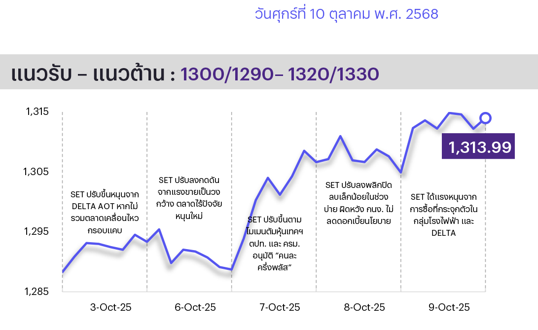 คาดตลาดปรับลง/พักฐาน หลังตลาดฯ แจ้ง DELTA เข้าเกณฑ์ติด Cash Balance สถิติในอดีตชี้ว่าจะให้ผลตอบแทนเป็นลบในวันถัดไปกดดันตลาด แม้ Delta Taiwan ได้แจ้งยอดขายเดือน ก.ย. เติบโต 19.2%MoM ซึ่งปกติมีทิศทางเดียวกัน แต่คาดว่าอาจยังไม่ชดเชยได้ สัปดาห์หน้าติดตามการออกมาตรการกระตุ้นเศรษฐกิจเที่ยวเมืองรอง ทางเทคนิค ตลาดชะลอตัวที่แนวต้านที่ให้ไว้ 1320 ยังไม่ผ่าน ส่วนแนวรับอยู่ที่ 1300/1290 พักไม่นานไม่ควรลงหลุดต่ำกว่า