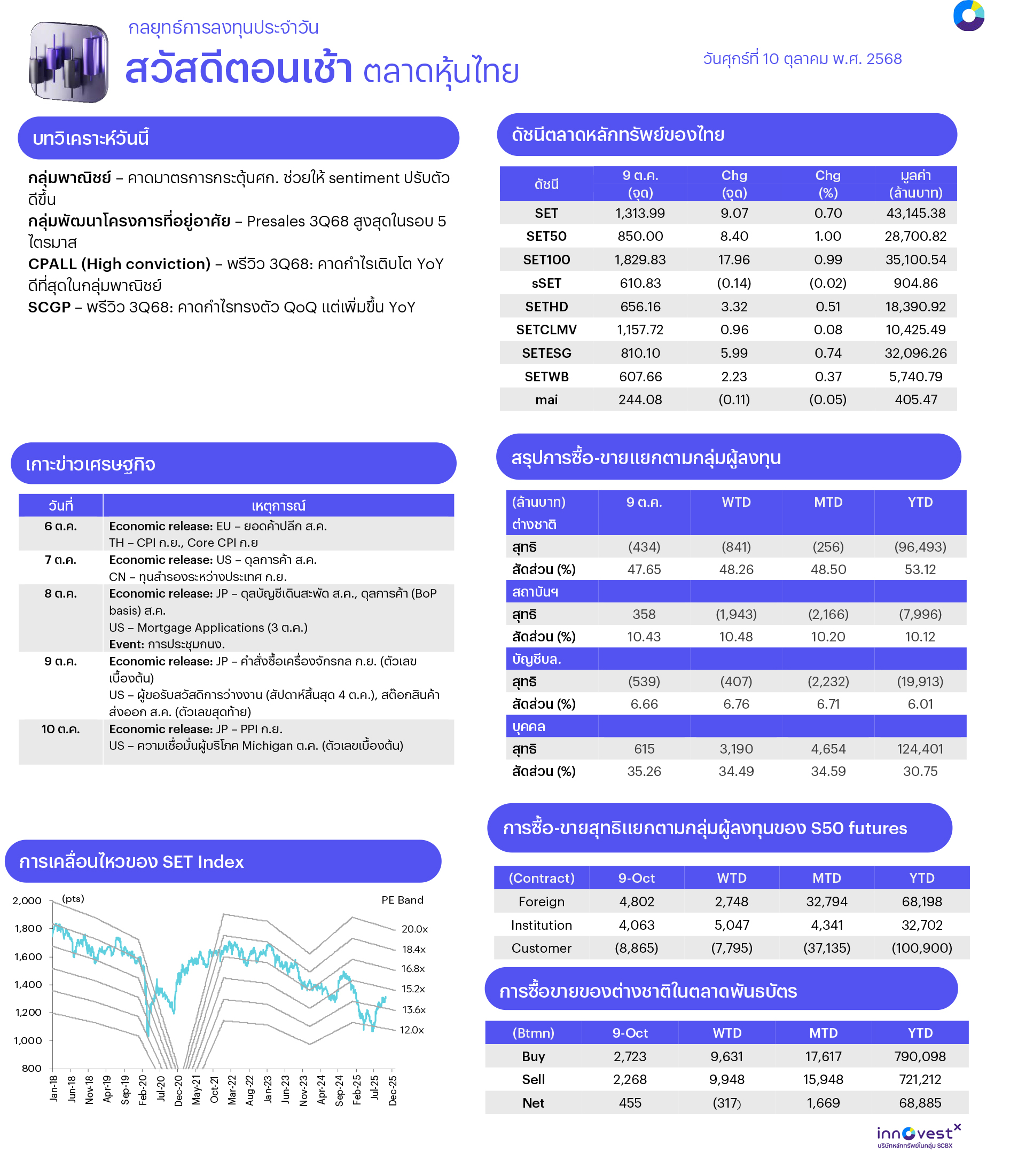 ช่วงสั้นมอง SET มีโอกาสพักฐานหรือไซด์เวย์ในกรอบแคบ เนื่องจากขาดปัจจัยหนุนใหม่มากระตุ้นบรรยากาศลงทุน ปัจจัยในประเทศตัวเลขเงินเฟ้อ ก.ย. ติดลบมากกว่าที่ตลาดคาดและติดลบต่อเนื่องเป็นเดือนที่หก หนุนให้ตลาดคาดหวัง กนง. จะยังมีการปรับลดดอกเบี้ยนโยบายในการประชุมวันที่ 17 ธ.ค. หลังวันที่ 8 ต.ค. กนง. มีมติคงดอกเบี้ยที่ 1.50% ตามที่เราคาด ส่วนปัจจัยต่างประเทศ FOMC Minutes ชี้ว่าเฟดมีความกังวลต่อภาวะตลาดแรงงานที่อ่อนแอ และ Dot Plot บ่งชี้ว่าจะลดดอกเบี้ยอีก 2 ครั้งในช่วงที่เหลือของปีนี้ ขณะที่การชัตดาวน์หน่วยงานของรัฐบาลสหรัฐคาดไม่มีผลกระทบต่อการลงทุน โดยในอดีตการชัตดาวน์ยาวนานสุดเกิดขึ้นในปี 2018-2019 ใช้ระยะเวลา 35 วัน ซึ่งทั้ง S&P และ SET ให้ผลตอบแทนเป็นบวก สะท้อนว่าตลาดไม่ได้ให้น้ำหนักต่อประเด็นนี้ ดังนั้นกลยุทธ์ลงทุนจึงคงแนะนำให้ “Selective Buy”