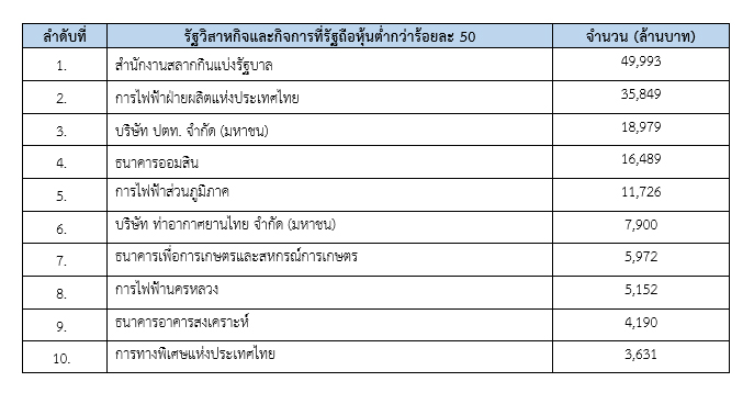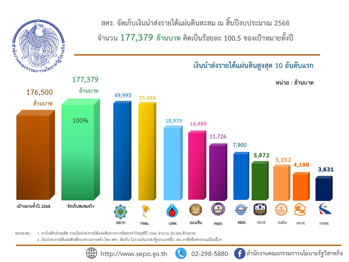 นายธิบดี วัฒนกุล ผู้อำนวยการสำนักงานคณะกรรมการนโยบายรัฐวิสาหกิจ (สคร.) เปิดเผยว่า ในปีงบ ประมาณ 2568 (1 ตุลาคม 2567 - 30 กันยายน 2568) สคร. มีเป้าหมายในการจัดเก็บเงินนำส่งรายได้แผ่นดิน/เงินปันผลจากรัฐวิสาหกิจและกิจการที่รัฐถือหุ้นต่ำกว่าร้อยละ 50 (เงินนำส่งรายได้แผ่นดินฯ) จำนวน 176,500 ล้านบาท โดย สคร. สามารถจัดเก็บเงินนำส่งรายได้แผ่นดินฯ สะสม รวมทั้งสิ้น จำนวน 177,379 ล้านบาท สูงกว่าเป้าหมายการจัดเก็บทั้งปีอยู่ที่ จำนวน 879 ล้านบาท หรือคิดเป็นร้อยละ 100.5 ทั้งนี้ รัฐวิสาหกิจที่นำส่งรายได้แผ่นดินหรือเงินปันผลสูงสุด 10 อันดับแรก แสดงได้ตามตาราง ดังนี้