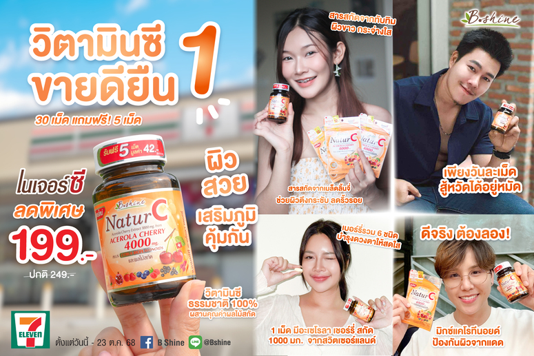 บีไชน์ เนเจอร์ซี อะเซโรลา เชอร์รี่ 1000 มก. สูตรใหม่ ให้วิตามินซีจากผลอะเซโรลาเชอร์รี่สด 4000 มก. เข้มข้นถึง 4 เท่า ช่วยเสริมภูมิคุ้มกัน เป็นวิตามินซีจากธรรมชาติ 100% ร่างกายจึงดูดซึมได้ดีกว่า อ่อนโยน ไม่ระคายเคืองกระเพาะ และมีซิตรัสไบโอฟลาโวนอยด์สูง ช่วยเพิ่มการดูดซึมวิตามินซีได้มากกว่า พร้อมด้วยสารสกัดจากทับทิมถึง 70 มก. บำรุงผิวให้กระจ่างใส สารสกัดจากเมล็ดลิ้นจี่ ช่วยให้ผิวกระชับ ลดริ้วรอย มิกซ์แคโรทีนอยด์ ช่วยปกป้องผิวจากแสงแดด และเบอร์รี่มิกซ์ 6 ชนิด บำรุงดวงตาให้สดใส ประโยชน์ครบในเม็ดเดียวเสริมภูมิคุ้มกัน ลดโอกาสการติดหวัด ลดอาการภูมิแพ้ ฟื้นฟูผิว บำรุงผิวพรรณให้สวยสดใส ลดริ้วรอย และต้านอนุมูลอิสระ แบบขวด 30 เม็ด (แถมฟรีอีก 5 เม็ด) มีโปรโมชั่นพิเศษ! เพียง 199 บาท จากราคาปกติ 249 บาท และสมาชิก All Member รับ 1 เหรียญ หาซื้อได้ที่ร้านเซเว่น อีเลฟเว่น ทุกสาขาทั่วประเทศ ตั้งแต่วันนี้ – 23 ตุลาคม 2568 เท่านั้น