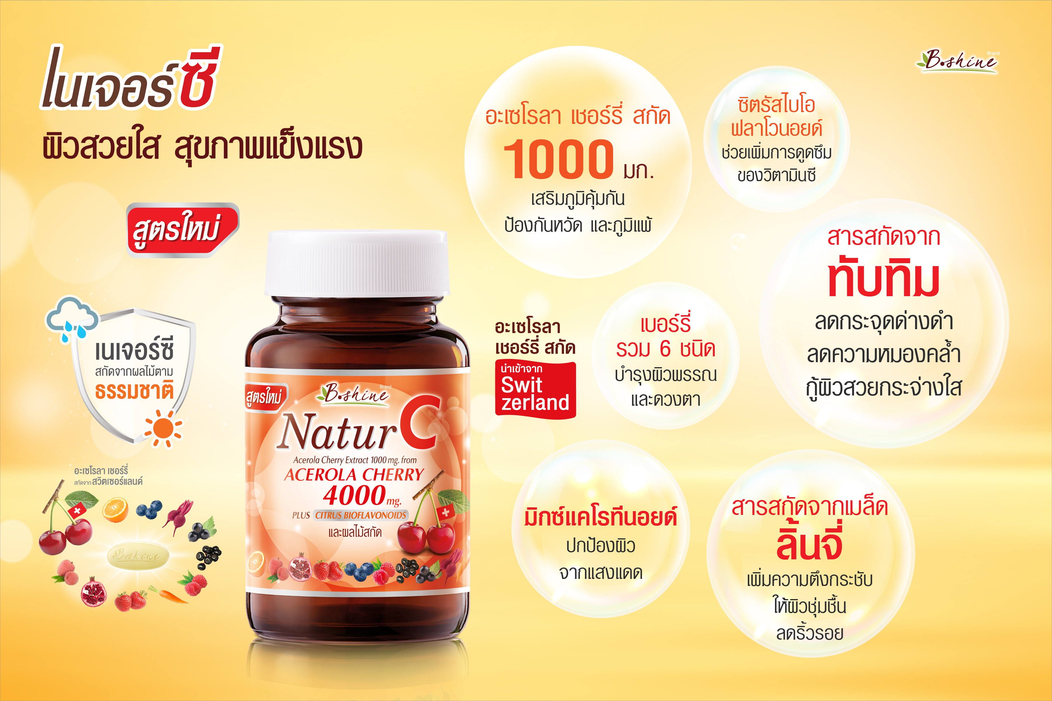 “บีไชน์ เนเจอร์ซี อะเซโรลา เชอร์รี่ 1000 มก.” โดดเด่นด้วยวิตามินซีจากอะเซโรลา เชอร์รี่ สกัดเข้มข้นถึง 1000 มก. (เทียบเท่าผลสด 4000 มก.) ซึ่งมีความเข้มข้นถึง 4 เท่า มากกว่าผลิตภัณฑ์ทั่วไปในท้องตลาด