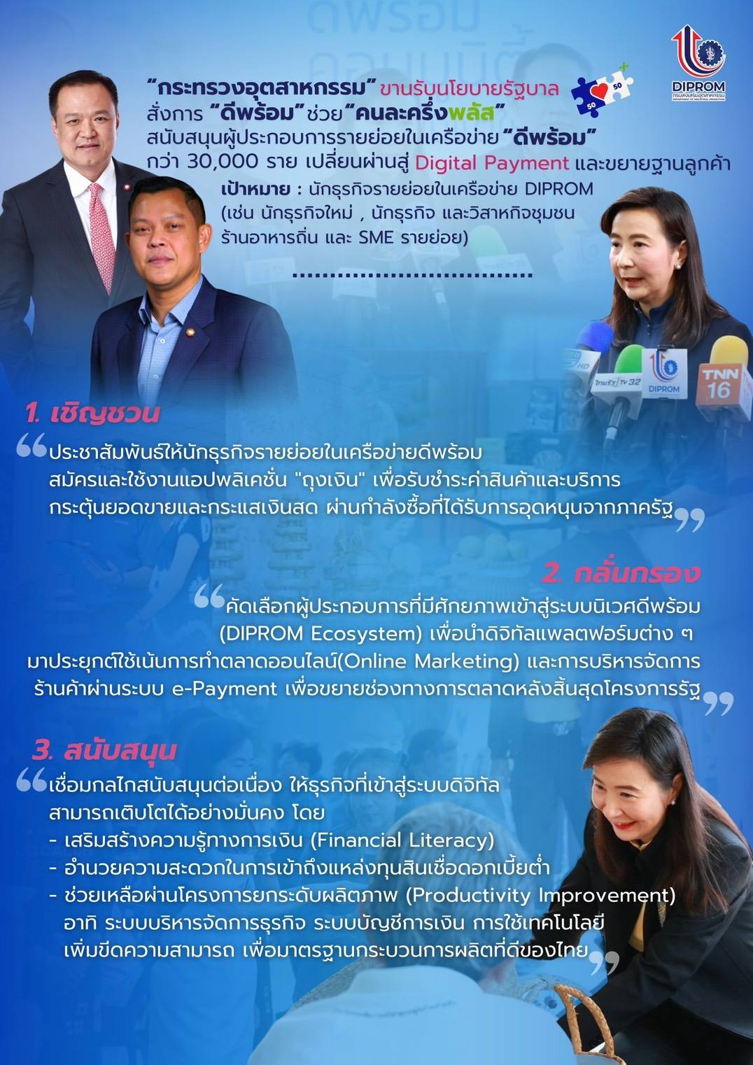 นายธนกร กล่าวต่อว่า สำหรับนักธุรกิจรายย่อยในเครือข่าย DIPROM เช่น นักธุรกิจใหม่ นักธุรกิจ และวิสาหกิจชุมชน ร้านอาหารถิ่น และ SME รายย่อย กระทรวงอุตสาหกรรมจะดำเนินการผ่าน 3 ยุทธ์ศาสตร์สำคัญ คือ 1. เชิญชวน โดยประชาสัมพันธ์ให้นักธุรกิจรายย่อยในเครือข่ายดีพร้อม สมัครและใช้งานแอปพลิเคชั่น "ถุงเงิน" เพื่อรับชําระค่าสินค้าและบริการ กระตุ้นยอดขายและกระแสเงินสด ผ่านกําลังซื้อที่ได้รับการอุดหนุนจากภาครัฐ 2. กลั่นกรอง โดยคัดเลือกผู้ประกอบการที่มีศักยภาพเข้าสู่ระบบนิเวศดีพร้อม (DIPROM Ecosystem) เพื่อนําดิจิทัลแพลตฟอร์มต่าง ๆ มาประยุกต์ใช้ เน้นการทําตลาดออนไลน์ (Online Marketing) และการบริหารจัดการ ร้านค้าผ่านระบบ e-Payment เพื่อขยายช่องทางการตลาดหลังสิ้นสุดโครงการรัฐ และ 3.สนับสนุน โดยเชื่อมกลไกสนับสนุนต่อเนื่องให้ธุรกิจที่เข้าสู่