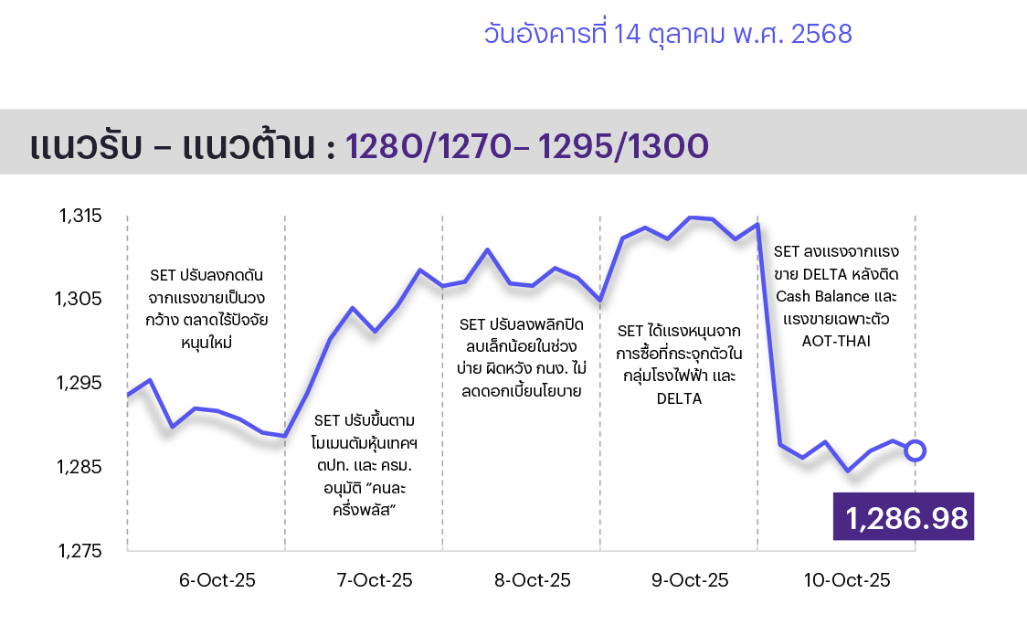 คาดตลาดผันผวนเพิ่ม แต่มองโอกาสรีบาวด์โดยเฉพาะตามแนวรับ ปธน. ทรัมป์ส่งสัญญาณประณีประนอม ไม่ต้องการให้ ศก. 2 ประเทศตกต่ำหากขึ้นภาษีจีน 100% ตลาดหุ้นเอเชียส่วนใหญ่เปิดปรับตัวลงแรงในวันจันทร์ก่อนมาปิดใกล้ระดับสูงสุดของวันเป็นสัญญาณบวก และลงไม่รุนแรงเมื่อเทียบฝั่งตะวันตกก่อนกลับมาขึ้นเมื่อคืน ในประเทศติดตามการออกมาตรการกระตุ้น ศก. เที่ยวเมืองรอง ทางเทคนิค ที่ 1280/1270 มีโอกาสรีบาวด์ ส่วนแนวต้านอยู่ที่ 1295/1300