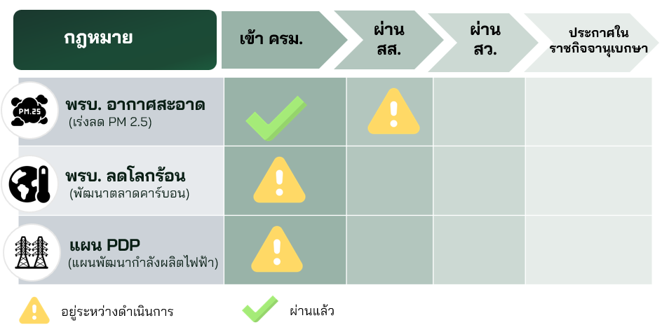 กฎหมายสำคัญ 3 ฉบับที่จะเป็นรากฐานแห่งความสำเร็จของเป้าหมาย Net Zero ได้แก่ พระราชบัญญัติอากาศสะอาด พระราชบัญญัติการเปลี่ยนแปลงสภาพภูมิอากาศ และแผนพัฒนากำลังผลิตไฟฟ้า (PDP) ฉบับปรับปรุง