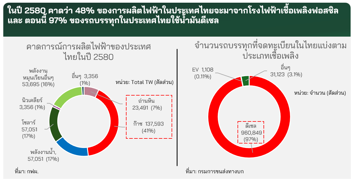 ตามแผนพัฒนากำลังผลิตไฟฟ้า (PDP) ฉบับปัจจุบัน คาดว่าในปี 2580 ร้อยละ 48 ของการผลิตไฟฟ้าทั้งหมดจะมาจากโรงไฟฟ้าที่ใช้เชื้อเพลิงฟอสซิล ขณะที่ร้อยละ 97 ของรถบรรทุกในประเทศไทยยังใช้เครื่องยนต์ดีเซล ซึ่งภาคโลจิสติกส์ยังคงพึ่งพาอยู่