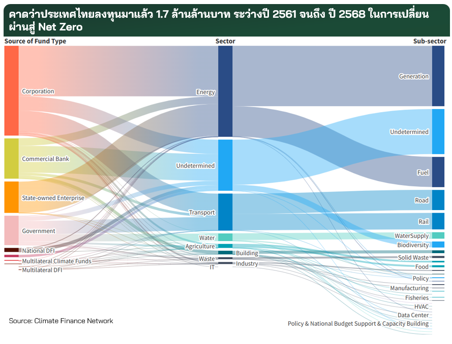คาดว่าประเทศไทยจะต้องใช้งบประมาณมากกว่า 1.28 ล้านล้านบาทต่อปี ในการเปลี่ยนผ่านสู่ Net Zero ภายในปี 2593 ในขณะที่ปัจจุบันใช้งบประมาณเพียงประมาณ 0.24 ล้านล้านบาทต่อปี ดังนั้นจึงจำเป็นต้องเพิ่มการลงทุนทั้งจากภาครัฐและภาคเอกชน แต่ในสัดส่วนและกลุ่มอุตสาหกรรมที่แตกต่างกัน