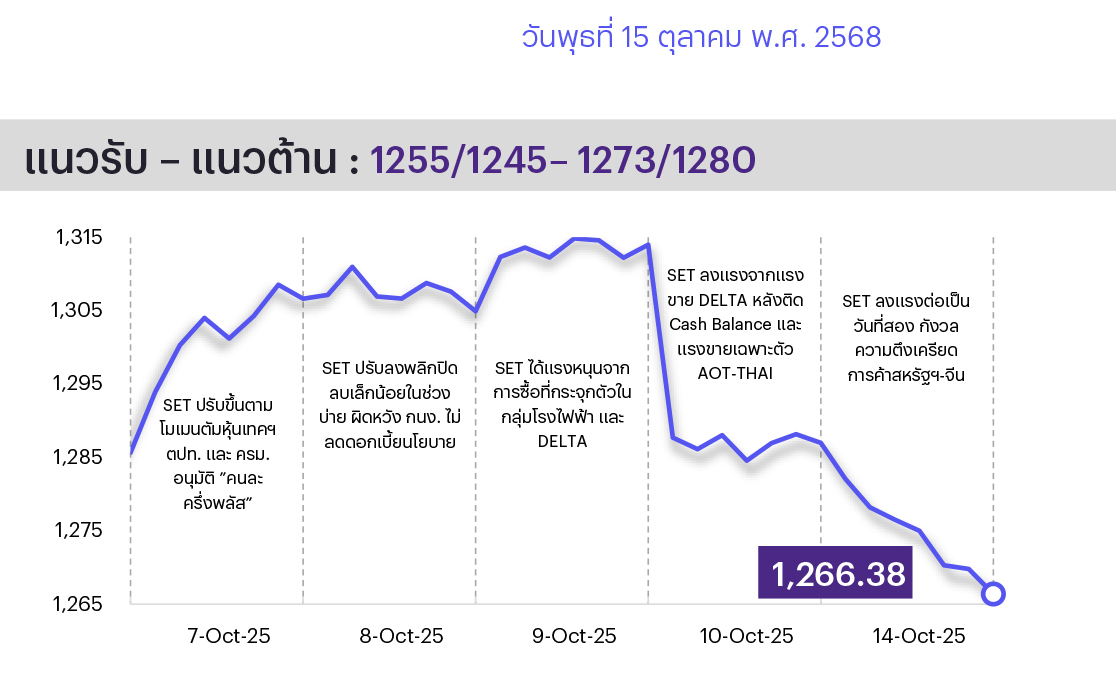 คาดตลาดไซด์เวย์ แต่ที่แนวรับมีโอกาสชะลอการลง สัญญาณสงครามการค้ากลับมา หลังจีนประกาศคว่ำบาตรบริษัทในสหรัฐฯ 5 แห่งที่เป็นบริษัทในเครือของ Hanwha Ocean จากเกาหลีใต้ สร้างความกดดันสงครามการค้าสหรัฐฯ-จีนรอบใหม่ ส่วนคลังเตรียมเสนอ Action Plan เข้า ครม. เศรษฐกิจหนุน ทางเทคนิคที่ 1255/1245 มีโอกาสชะลอการลงสั้นได้ แต่หากทิศทางยังเป็นบวกแกว่งขึ้นไม่ควรอ่อนตัวลงหลุดต่ำกว่าบริเวณนี้อีกแล้ว แนวต้านประเมินไว้ที่ 1273/1280