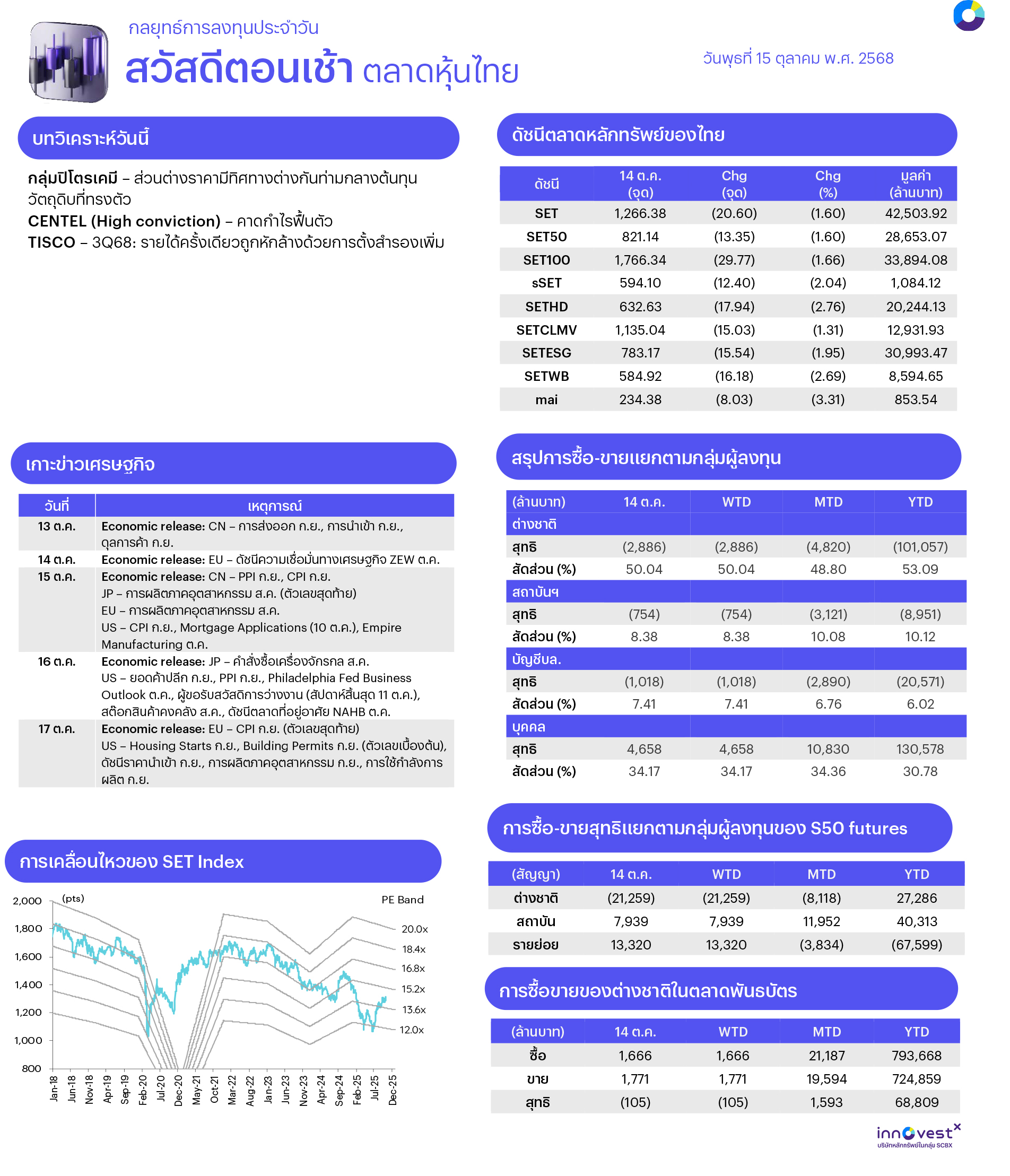 • ติดตามการประชุม ครม. เศรษฐกิจในวันนี้ (15 ต.ค.) เวลา 10:00 น. คาดคลังจะเสนอแนวทางขับเคลื่อน ศก. ไทยสำหรับช่วง 4 เดือนนี้, พิจารณามาตรการกระตุ้นท่องเที่ยวช่วงปลายปี-เร่งเบิกจ่ายงบสัมมนา, การเร่งรัดการเบิกจ่ายงบ 1Q69FY (ต.ค.-ธ.ค. 2568), การเจรจาภาษีการค้ากับสหรัฐฯ และการเจรจา FTA