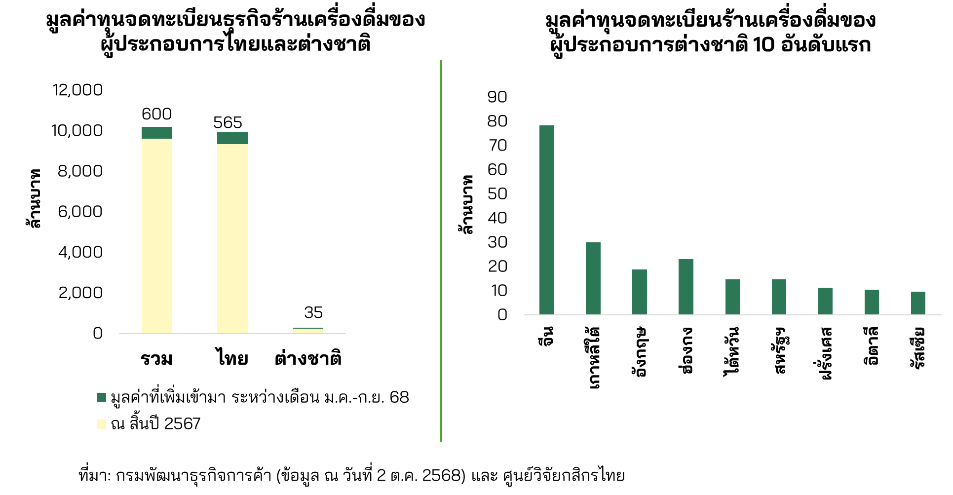 - ผู้ประกอบการต่างชาติสนใจลงทุนในไทย เห็นได้ว่า แบรนด์เครื่องดื่มจากต่างประเทศเข้ามาเปิดสาขาและขยายแฟรนไชส์ในตลาดไทยมากขึ้น อาทิ กลุ่มชาผลไม้ ชานมไข่มุกและเครื่องดื่มน้ำปั่นผลไม้ (สมูทตี้) จากข้อมูลของกรมพัฒนาธุรกิจการค้า ระบุว่า ในช่วง 9 เดือนแรกของปี 2568 มูลค่าทุนจดทะเบียนใหม่จากนักลงทุนต่างชาติเพิ่มขึ้น 13.9% จากมูลค่าทุนจดทะเบียนสะสม ณ สิ้นปี 2567 (รูปที่ 2) โดยมูลค่าการลงทุน ณ 2 ต.ค. 2568 ส่วนใหญ่มาจากจีน รองลงมาเป็นนักลงทุนจากเกาหลีใต้ อังกฤษ