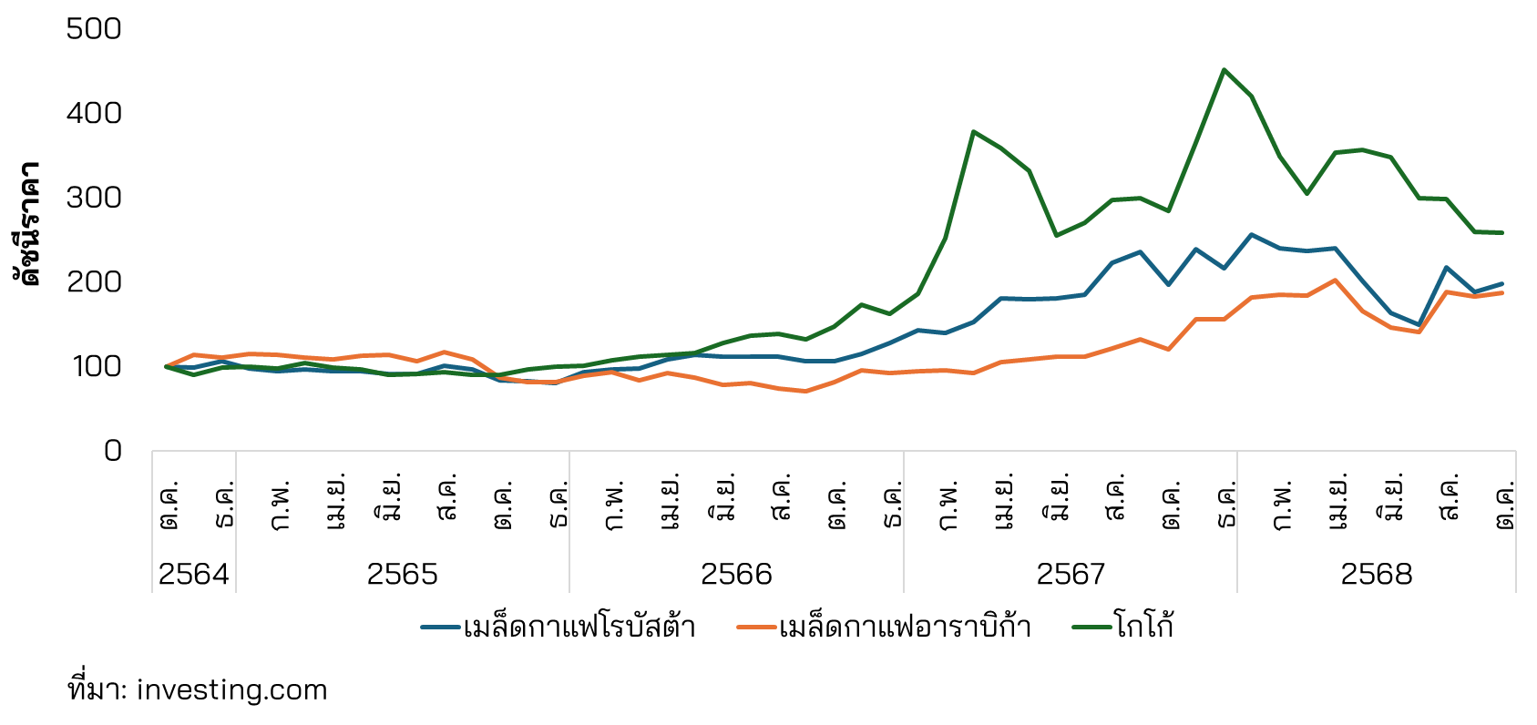 รูปที่ 3 ดัชนีราคาซื้อขายล่วงหน้าของเมล็ดกาแฟและโกโก้ยังผันผวน