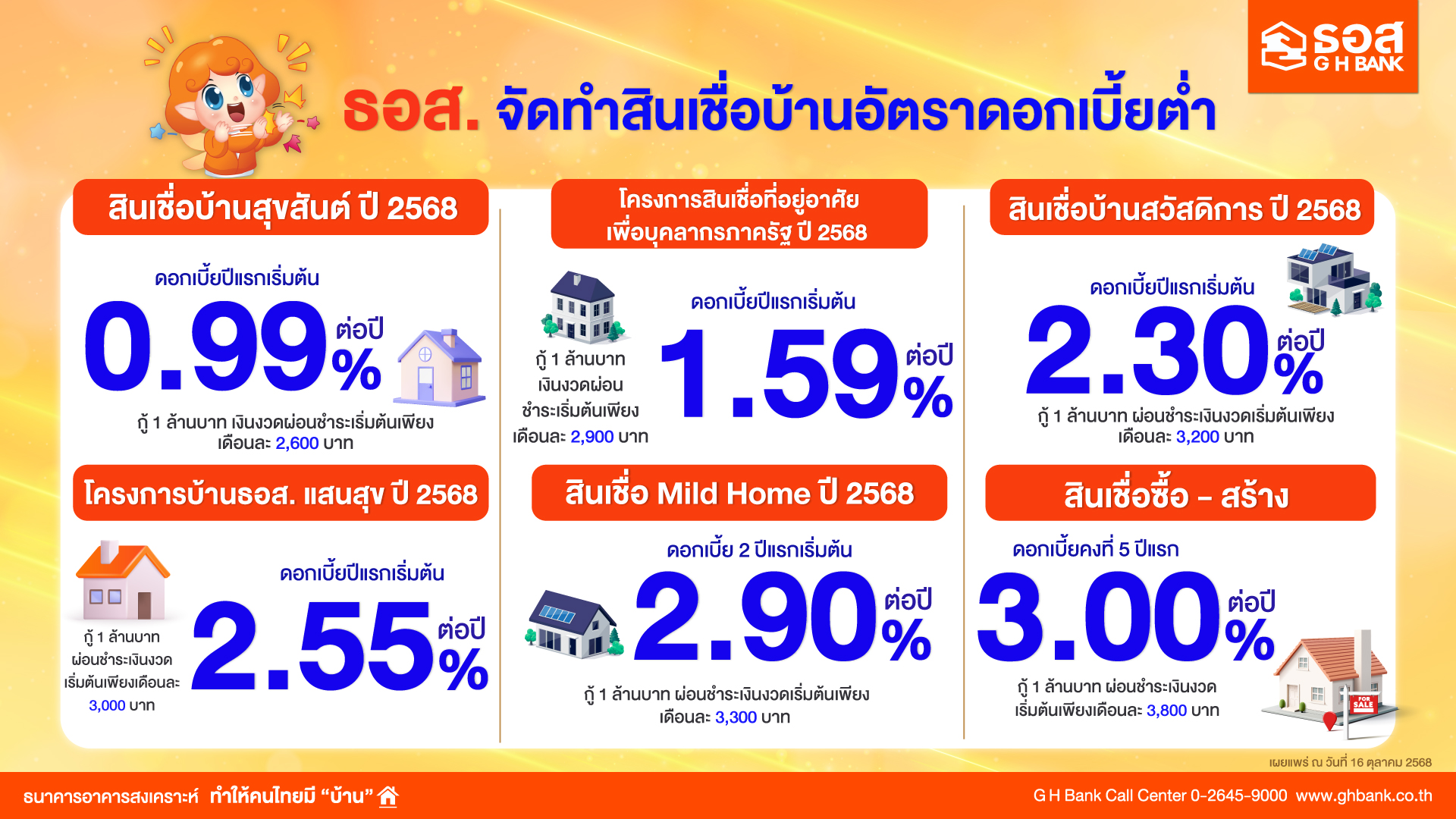 ธนาคารอาคารสงเคราะห์ (ธอส.) จัดทำโปรโมชันสินเชื่ออัตราดอกเบี้ยต่ำสนับสนุนคนไทยมีบ้านเป็นของตนเองส่งท้ายปี 2568 ดันเม็ดเงินลงสู่ภาคอสังหาริมทรัพย์ ส่งผลบวกต่อระบบเศรษฐกิจ ครอบคลุมทุกกลุ่มอาชีพ ลดภาระค่าครองชีพให้กับลูกค้าและประชาชน นำโดยสินเชื่ออัตราดอกเบี้ยเริ่มต้นเพียง 0.99% ต่อปี ผ่อนชำระนานสูงสุด 40 ปี กรณีกู้ 1 ล้านบาท เงินงวดผ่อนชำระเริ่มต้นเพียงเดือนละ 2,600 บาท เท่านั้น! สนใจยื่นคำขอกู้ได้แล้วผ่าน Application : GHB ALL GEN และ ธอส. ทุกสาขาทั่วประเทศ
