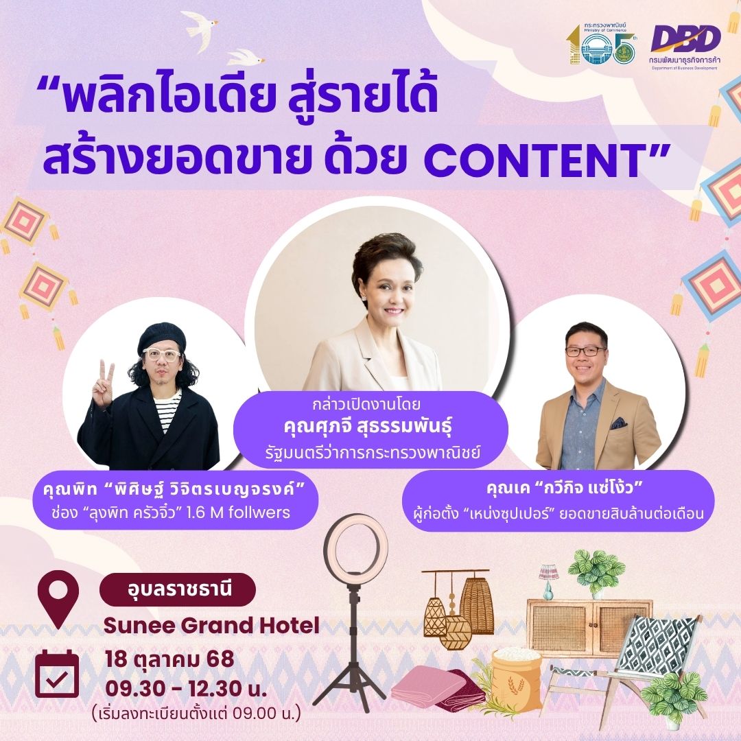 นายพูนพงษ์ นัยนาภากรณ์ อธิบดีกรมพัฒนาธุรกิจการค้า กระทรวงพาณิชย์ เปิดเผยว่า กรมพัฒนาธุรกิจการค้า ชวนผู้ประกอบการจังหวัดอุบลราชธานีและพื้นที่ใกล้เคียงเข้าร่วมอบรมหลักสูตร “พลิกไอเดียสู่รายได้ สร้างยอดขายด้วย Content” ในวันเสาร์ที่ 18 ตุลาคม 2568 ณ โรงแรมสุนีย์ แกรนด์ จ.อุบลราช ธานี เสริมทักษะการใช้คอนเทนต์เป็นช่องทางการตลาดช่วยสร้างโอกาสการเข้าถึงกลุ่มลูกค้าใหม่ๆ แก่ผู้ประกอบการทุกขนาด รวมถึงเป็นช่องทางสำคัญในการสร้างรายได้ ขยายฐานลูกค้าให้เติบโต และต่อยอดสู่ตลาดออนไลน์ได้อย่างกว้างขวาง ซึ่งผู้เข้าร่วมการอบรมสามารถนำความรู้ไปประยุกต์ใช้ได้จริง สร้างความแตกต่างเหนือคู่แข่ง และเพิ่มโอกาสในการสร้างรายได้ โดยกรมฯ ได้เชิญวิทยากรผู้เชี่ยวชาญด้าน Content Marketing มาร่วมเผยเคล็ดลับและแบ่งปันประสบการณ์ อาทิ คุณพิศิษฐ์ วิจิตรเบญจรงค์ Tiktoker ชื่อดังจากช่อง “ลุงพิท ครัวจิ๋ว” (ผู้ติดตามกว่า 1.6 ล้านราย) ในหัวข้อ เคล็ดลับหาเงินแสนด้วยมือถือเครื่องเดียว พร้อมเทคนิคการสร้างคอนเทนต์ให้ทันกระแสด้วยคลิปวิดีโอสั้นแบบตรงกลุ่มเป้าหมาย และ คุณกวีกิจ แซ่โง้ว ผู้ก่อตั้ง “เหน่งซุปเปอร์” ที่สามารถสร้างรายได้ต่อเดือนกว่า 10 ล้านบาท ในหัวข้อ ถอดบทเรียนให้ปัง ทั้งออนไลน์ และออฟไลน์ สร้างยอดขายหลักล้าน