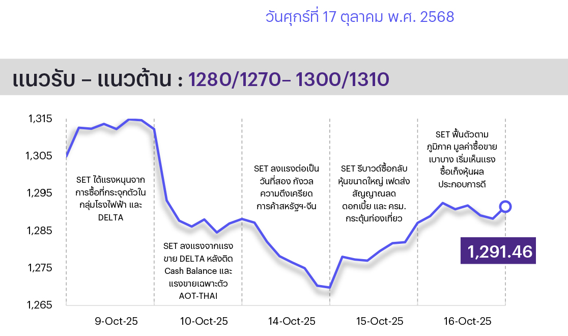 คาดตลาดไซด์เวย์/พักตัว ตลาดไม่ผ่าน 1300 ที่ให้ไว้ ตลาดกลับมามีแรงกดดันหลังโฆษกกระทรวงพาณิชย์จีนประเมินว่าการควบคุมแร่หายากของจีนเป็นสิ่งที่ถูกกฎหมายและสหรัฐฯ บิดเบือนเกินความจริงกดดันตลาด และความกังวลเรื่องสินเชื่อธนาคารสหรัฐฯ คุณมิแรนหนุนเฟดลดดอกเบี้ยต่อ แต่ตลาด Priced In แล้ว สัปดาห์หน้าติดตามการ Action Plan กระทรวงพลังงาน การประชุมพรรคคอมมิวนิสต์จีน 4th Plenum เทคนิคติด 1300 หากยังบวกไม่ควรหลุด 1280/1270