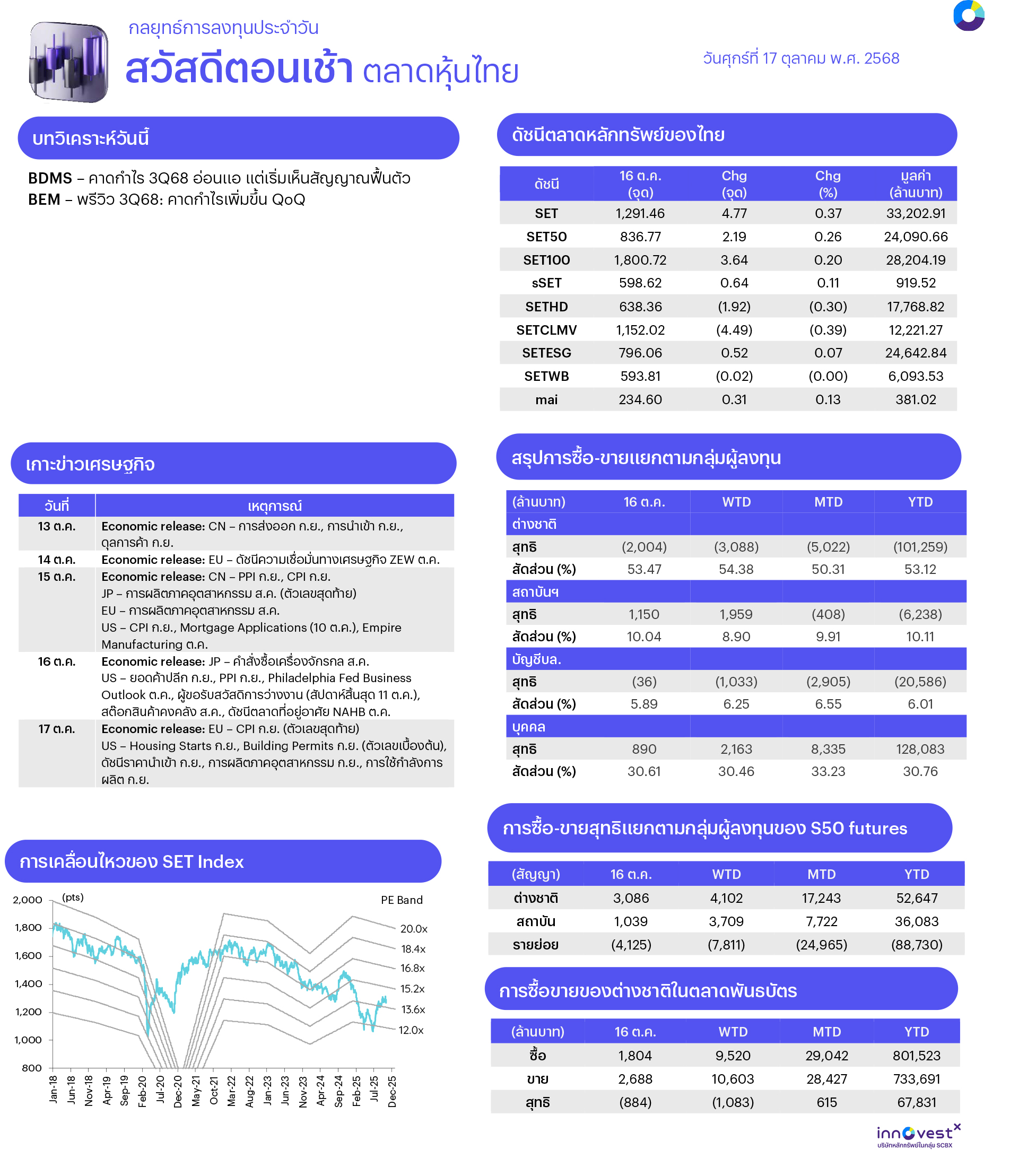 ช่วงสั้นมอง SET มีโอกาสแกว่งตัวไซด์เวย์รอปัจจัยหนุนใหม่ๆ ปัจจัยในประเทศติดตามรัฐบาลมีแผนออกมาตรการกระตุ้นเศรษฐกิจทุกสัปดาห์ซึ่งคาดจะมีส่วนช่วยประคองตลาด ในสัปดาห์นี้คาด รมว. คลังจะเสนอ ครม. พิจารณามาตรการภาษีเพื่อสนับสนุนการท่องเที่ยวเมืองรอง ส่วนปัจจัยต่างประเทศ คาดกรณีสหรัฐฯ ขึ้นภาษีกับจีน 100% มีท่าทีประณีประนอมมากขึ้น ประเมินผลกระทบต่อหุ้นไทยจำกัด แต่ความผันผวนของตลาดมีโอกาสเพิ่มขึ้น ติดตามตัวเลขเศรษฐกิจสำคัญของสหรัฐฯ อาทิ CPI, PPI และยอดค้าปลีก ก.ย. 2568 แม้ตลาดคาดจะเพิ่มขึ้น MoM แต่การชัตดาวน์หน่วยงานของรัฐบาลสหรัฐฯ อาจทำให้งดเผยแพร่ได้ซึ่งอาจทำให้ตลาดขาดข้อมูลชี้นำ ดังนั้นกลยุทธ์ลงทุนจึงคงแนะนำให้ “Selective Buy”