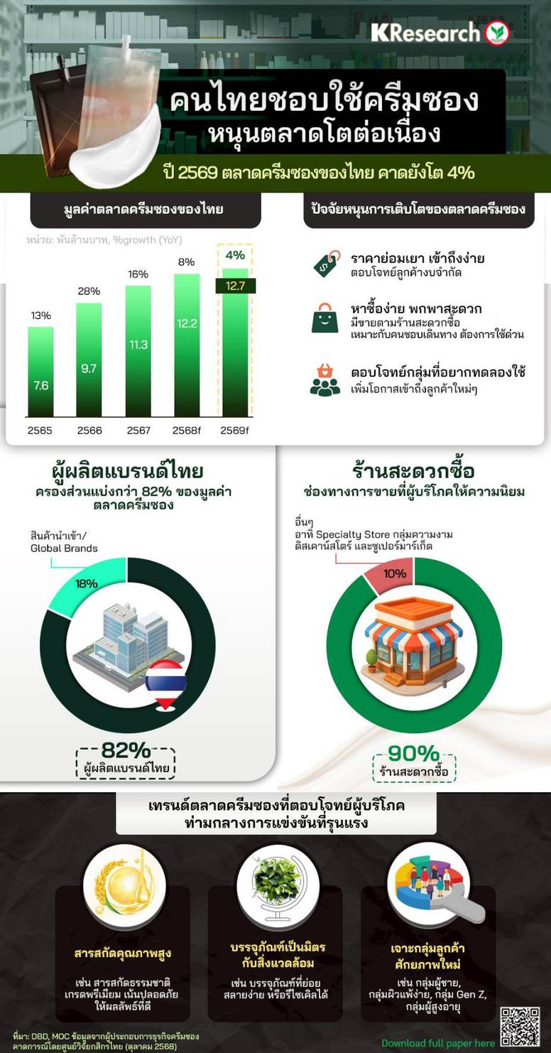 ศูนย์วิจัยกสิกรไทย คาดว่า ปี 2569 ตลาดครีมซองของไทย จะมีมูลค่าราว 12,700 ล้านบาท หรือโตราว 4.0% โดยมีปัจจัยหนุนจากราคาที่ย่อมเยา เข้าถึงง่าย สามารถหาซื้อได้ง่าย พกพาสะดวก รวมถึงตอบโจทย์ลูกค้าที่อยากทดลองใช้