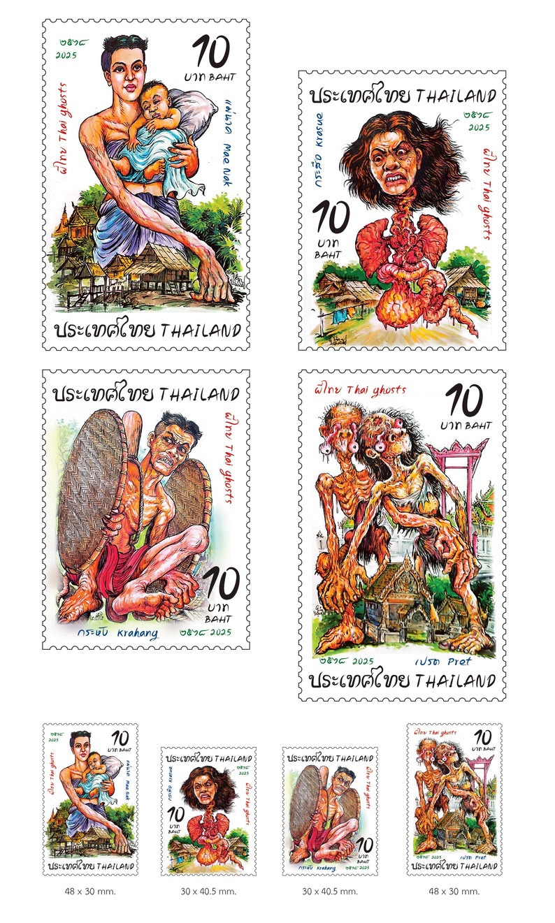 สำหรับความน่าสนใจของแสตมป์ชุดพิเศษ “แสตมป์ผีไทย” (Thai Ghosts) คือการหยิบยก “4 ผียอดนิยมของไทย” ที่อยู่ในใจคนไทยทุกยุคสมัยมาถ่ายทอดผ่านมุมมองใหม่ คือ แม่นาคพระโขนง ผีกระสือ ผีกระหัง และผีเปรต ตำนานความหลอนที่เคยทำให้คนหลับไม่ลงในวัยเด็ก วันนี้ได้ถูกปลุกให้กลายเป็น “Pop Icon” ที่เต็มไปด้วยเอกลักษณ์เฉพาะตัว โดยแสตมป์ผีไทยทั้งสี่ดวงไม่เพียงสะท้อนความเชื่อ ความกลัวผ่านเรื่องเล่าสืบต่อกันมาของผู้คน แต่ยังบ่งบอกถึงอารมณ์และจิตวิญญาณของสังคมไทยในแต่ละยุคจนมาเป็น “วัฒนธรรมร่วมสมัยในคราบตำนาน” ที่มีเสน่ห์ ไม่ต่างจาก แดร็กคูล่า (Dracula) แฟรงเกนสไตน์ (Frankenstein) หรือ แม่มด (Witch) ซึ่งต่างกลายเป็นสัญลักษณ์ของวัฒนธรรมตะวันตก โดย 4 ผีไทย ระดับเลเจนด์ในแสตมป์คอลเลกชันพิเศษนี้ถูกถ่ายทอดเรื่องราวและตีความผ่านลายเส้น ดังนี้