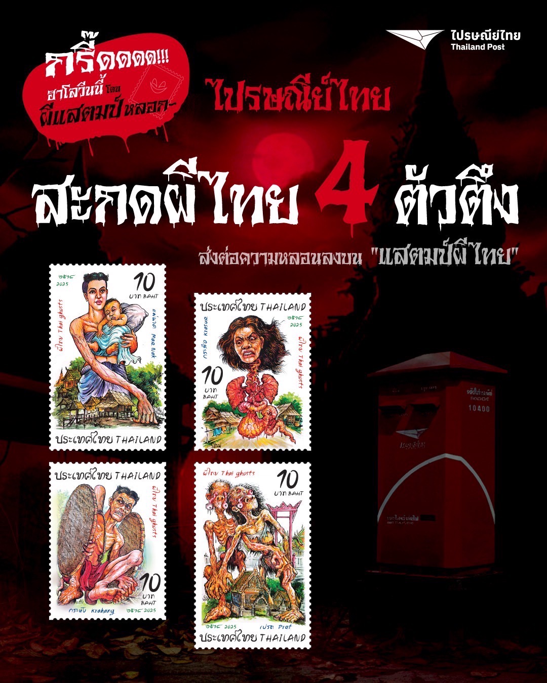 ฮาโลวีนปีนี้ ไม่ต้องบินไกลไปถึงต่างประเทศเพื่อสัมผัสความหลอนต้นตำรับ เพราะไปรษณีย์ไทยขอชวนคนไทยเปิดประสบการณ์ความหลอนแบบไทยแท้ ผ่านแสตมป์ชุดพิเศษ “ผีไทย Thai Ghosts” ครั้งแรกที่ตำนานผีไทยถูกตีความใหม่ให้ร่วมสมัยในรูปแบบศิลปะบนดวงแสตมป์ ที่ถ่ายทอดเสน่ห์ของความเชื่อพื้นบ้านผ่าน 4 ผีระดับตำนาน ทั้ง แม่นาค – ผีกระสือ – ผีกระหัง – ผีเปรต ที่จะมาสะกดทุกสายตาด้วยงานออกแบบที่ผสานระหว่างความขลังและศิลปะร่วมสมัย พร้อมส่งต่อป็อปคัลเจอร์ความหลอนแบบไทยให้กลายเป็นของสะสมที่ทั้งเท่และมีเรื่องราว
