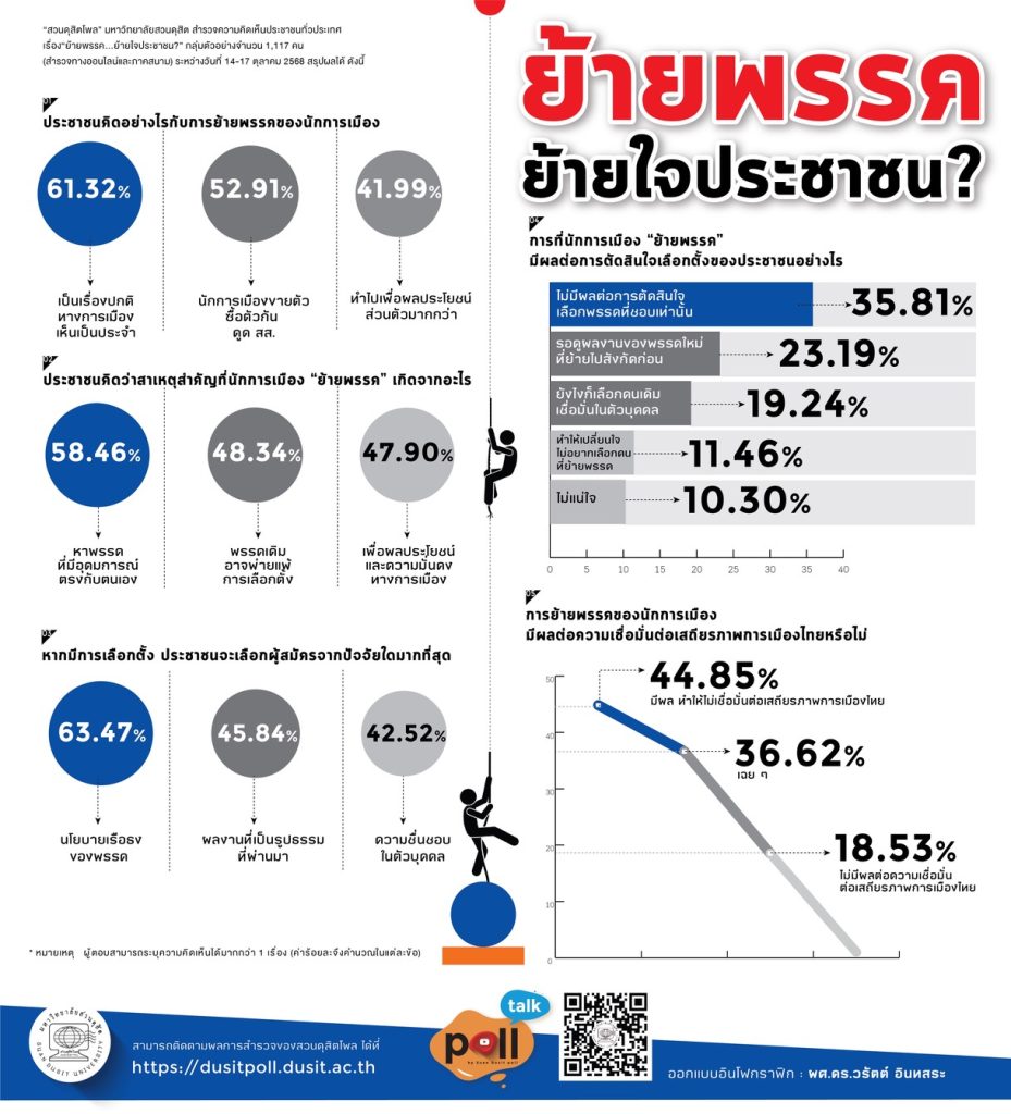 “สวนดุสิตโพล” มหาวิทยาลัยสวนดุสิต สำรวจความคิดเห็นประชาชนทั่วประเทศ เรื่อง “ย้ายพรรค...ย้ายใจประชาชน?” กลุ่มตัวอย่าง จำนวน 1,117 คน (สำรวจทางออนไลน์และภาคสนาม) ระหว่างวันที่ 14-17 ตุลาคม 2568 พบว่า กลุ่มตัวอย่างมองว่าการย้ายพรรคเป็นเรื่องปกติทางการเมือง เห็นเป็นประจำ ร้อยละ 61.32 รองลงมาคือ มองว่านักการเมืองขายตัว ซื้อตัวกัน ดูด สส. ร้อยละ 52.91 สาเหตุที่นักการเมืองย้ายพรรคเกิดจากต้องการหาพรรคที่มีอุดมการณ์ตรงกับตนเอง ร้อยละ 58.46 รองลงมาคือ คิดว่าพรรคเดิมอาจแพ้การเลือกตั้ง ร้อยละ 48.34 ทั้งนี้หากมีการเลือกตั้งจะตัดสินใจเลือกผู้สมัครจากนโยบายเรือธงของพรรค ร้อยละ 63.47 รองลงมาคือ ผลงานที่เป็นรูปธรรม ร้อยละ 45.84 โดยการย้ายพรรคไม่มีผลต่อการตัดสินใจ เลือกพรรคที่ชอบเท่านั้น ร้อยละ 35.81 สุดท้ายการย้ายพรรคของนักการเมืองทำให้รู้สึกไม่เชื่อมั่นต่อเสถียรภาพ การเมืองไทย ร้อยละ 44.85