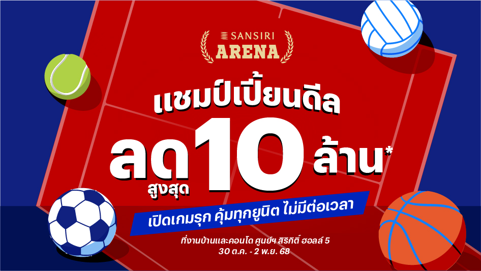 พบกับ “SANSIRI ARENA” แชมป์เปี้ยนดีล ลดสูงสุด 10 ล้าน* ที่งานมหกรรมบ้านและคอนโด ศูนย์ประชุมแห่งชาติสิริกิติ์ Hall 5 เริ่ม 30 ต.ค. – 2 พ.ย. 2568
