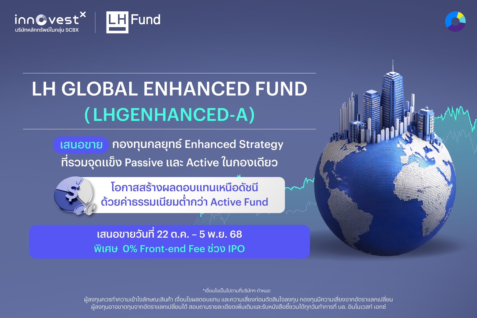 บริษัทหลักทรัพย์ อินโนเวสท์ เอกซ์ จำกัด (InnovestX) เรือธงด้านการลงทุนภายใต้กลุ่มเอสซีบี เอกซ์ (SCBX Group) ตอกย้ำภาพผู้นำแพลตฟอร์มลงทุนครบวงจรชั้นนำ จับมือ บริษัทหลักทรัพย์จัดการกองทุน แลนด์ แอนด์ เฮ้าส์ จำกัด (LH Fund) เปิดตัว กองทุน LH Global Enhanced Fund หรือ “LHGENHANCED-A” กองทุนกลยุทธ์ Enhanced Strategy ที่รวมจุดแข็งของกองทุน Passive และ Active ไว้ในกองเดียว เพื่อสร้างสมดุลระหว่างความมั่นคงและโอกาสเติบโต จากการกระจายลงทุนในหุ้นทั่วโลก พร้อมสร้างผลตอบแทนส่วนเสริมผ่าน Mega Trend โลก เช่น AI Ecosystems, Quantum Technology, Space Economy/Defense และ Nuclear Energy การเปิดตัวกองทุนครั้งนี้สะท้อนจุดยืนของ InnovestX ในการเป็น ผู้นำด้านนวัตกรรมการลงทุน ที่นำเสนอทางเลือกการลงทุนร่วมกับพันธมิตรชั้นนำ เพื่อตอบโจทย์นักลงทุนไทยยุคใหม่ที่ต้องการทั้งความมั่นคง ผลตอบแทน และค่าธรรมเนียมที่เหมาะสม เสนอขาย (IPO) ช่วงวันที่ 22 ตุลาคม – 5 พฤศจิกายน 2568 พร้อมโปรโมชัน ฟรีค่าธรรมเนียมการขาย (Front-end fee) สำหรับจองซื้อได้เฉพาะผ่าน แพลตฟอร์ม InnovestX เท่านั้น
