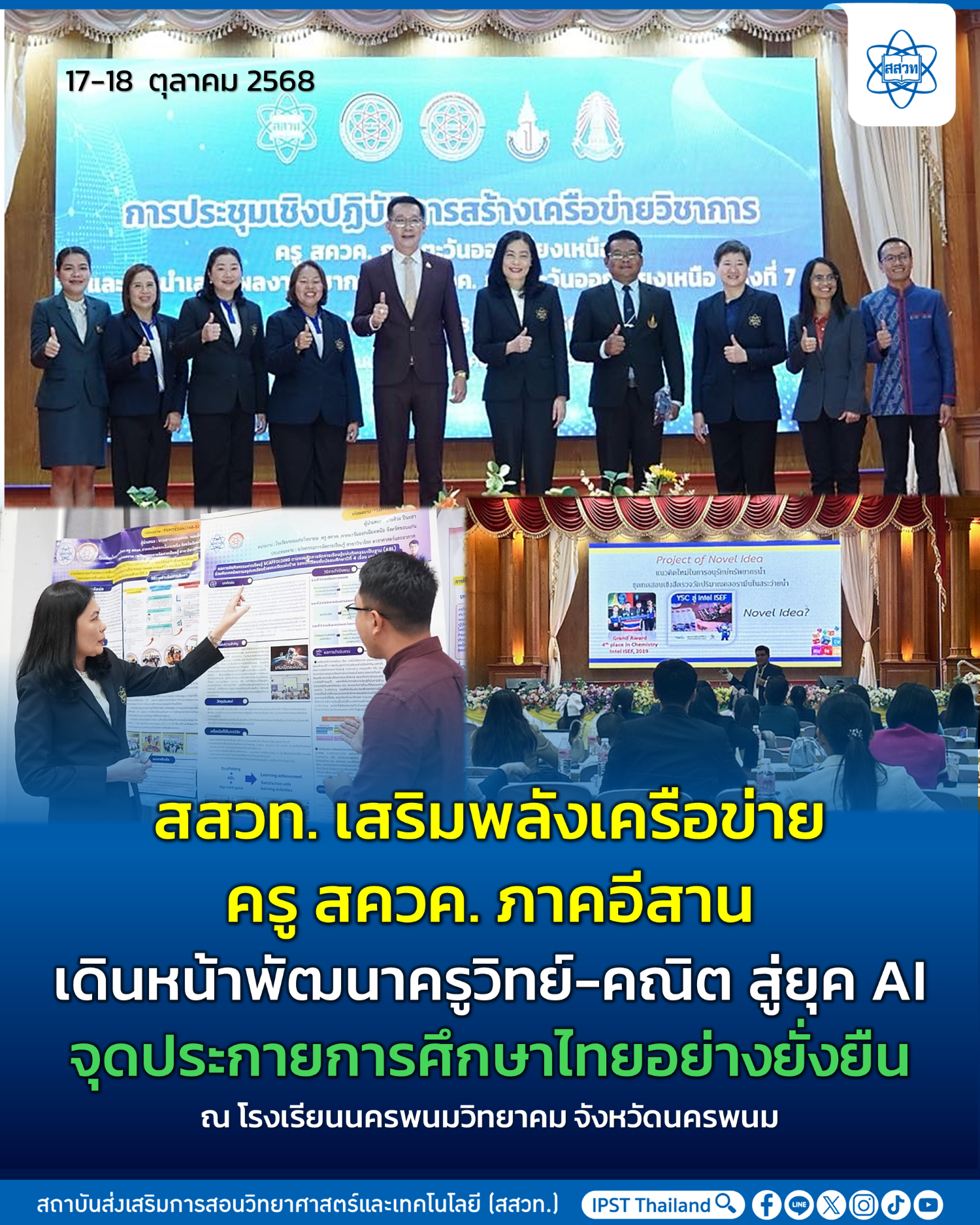 ดร.สุพรรณี ชาญประเสริฐ ผู้ช่วยผู้อำนวยการสถาบันส่งเสริมการสอนวิทยาศาสตร์และเทคโนโลยี (สสวท.) เข้าร่วมการประชุมเครือข่ายวิชาการครู สควค. ภาคตะวันออกเฉียงเหนือ และการประชุมวิชาการนำเสนอผลงาน ครู สควค. ภาคตะวันออกเฉียงเหนือ ครั้งที่ 7 ระหว่างวันที่ 17 – 18 ตุลาคม 2568 ณ โรงเรียนนครพนมวิทยาคม จังหวัดนครพนม พร้อมบรรยายถึงแนวทางการพัฒนาครู สควค. ผ่านการขับเคลื่อนร่วมกับศูนย์เครือข่ายวิชาการครู สควค. ในภูมิภาค เพื่อเสริมสร้างศักยภาพครูและยกระดับคุณภาพการเรียนการสอนวิทยาศาสตร์ คณิตศาสตร์ และเทคโนโลยีให้สอดคล้องกับการเปลี่ยนแปลงของโลกยุคใหม่ โดยการประชุมในครั้งนี้ยังได้รับเกียรติจาก นายภูวนารถ ตั้งศิริ ผู้อำนวยการโรงเรียนนครพนมวิทยาคม เป็นประธานในพิธีเปิดงานประชุมอีกด้วย